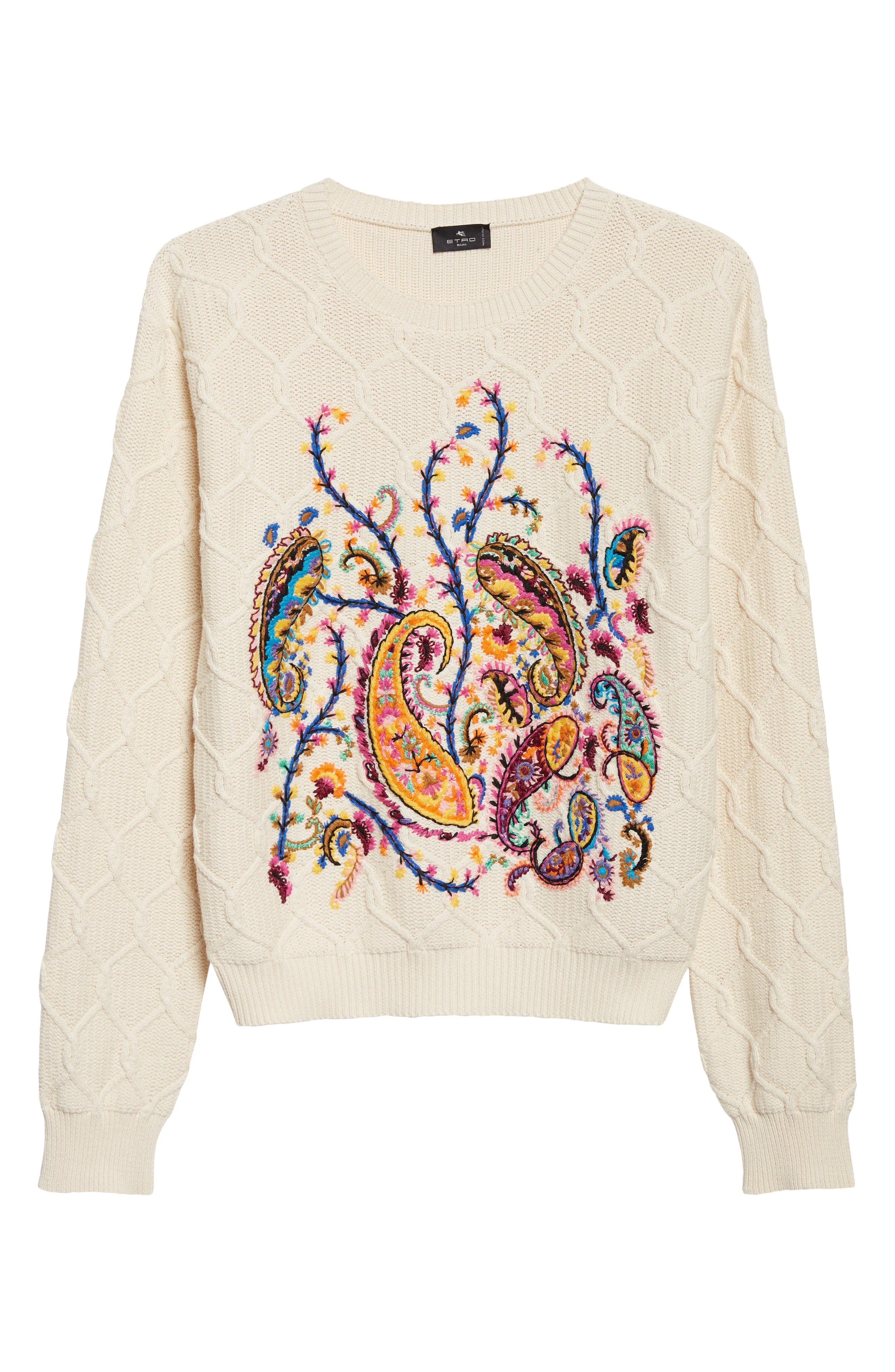 The label's iconic paisley swirls are rendered in vivid embroidery on a subtly cropped sweater knit with interlocking cables. Crewneck Long sleeves Ribbed cuffs and hem 89% cotton, 9% viscose, 2% polyamide with 44% wool, 43% acrylic, 13% cotton embroidery Dry clean Made in Italy Designer Clothing