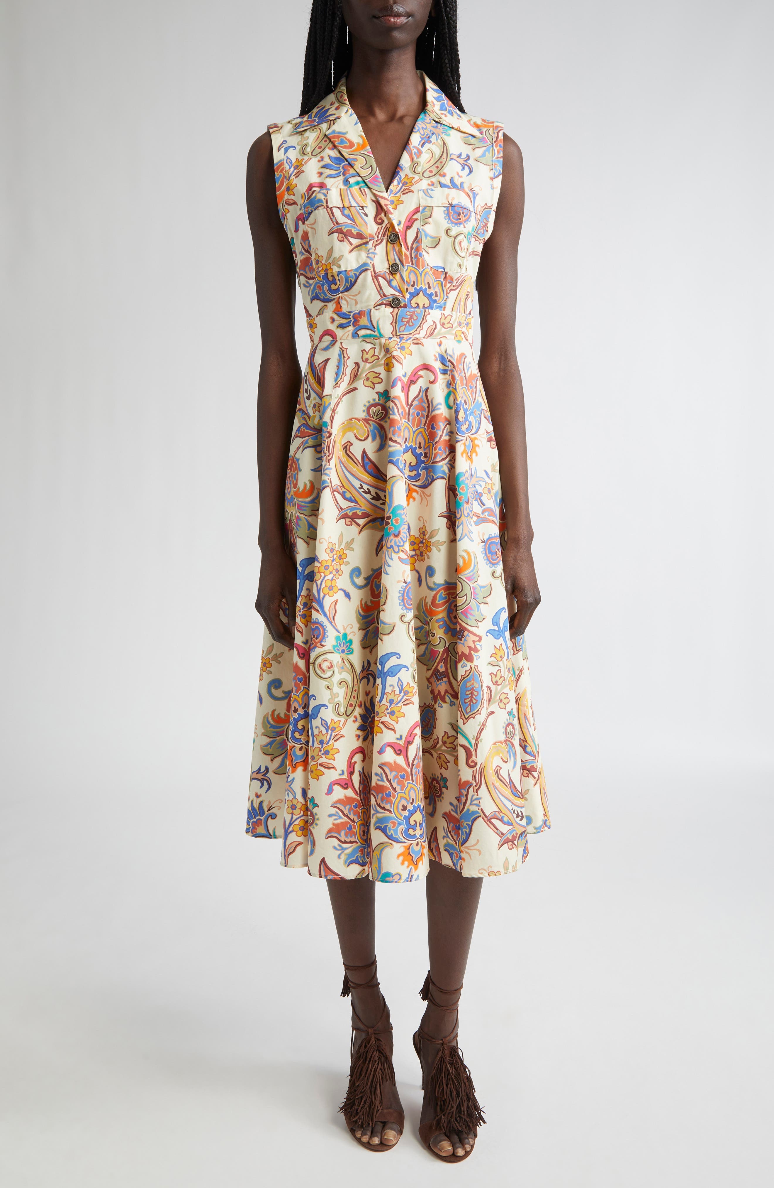 Etro's boho-eclecticism takes a coastal turn in this crisp cotton-poplin midi dress featuring house-signature paisley motifs entwined with vibrant flora, evoking the vivid beauty of Mediterranean islands—the brand's summer '25 muse. Pegaso medallion buttons add another quintessential Etro touch. Front button closure Notched collar Sleeveless Chest patch pockets 100% cotton Dry clean Made in Italy Designer Clothing