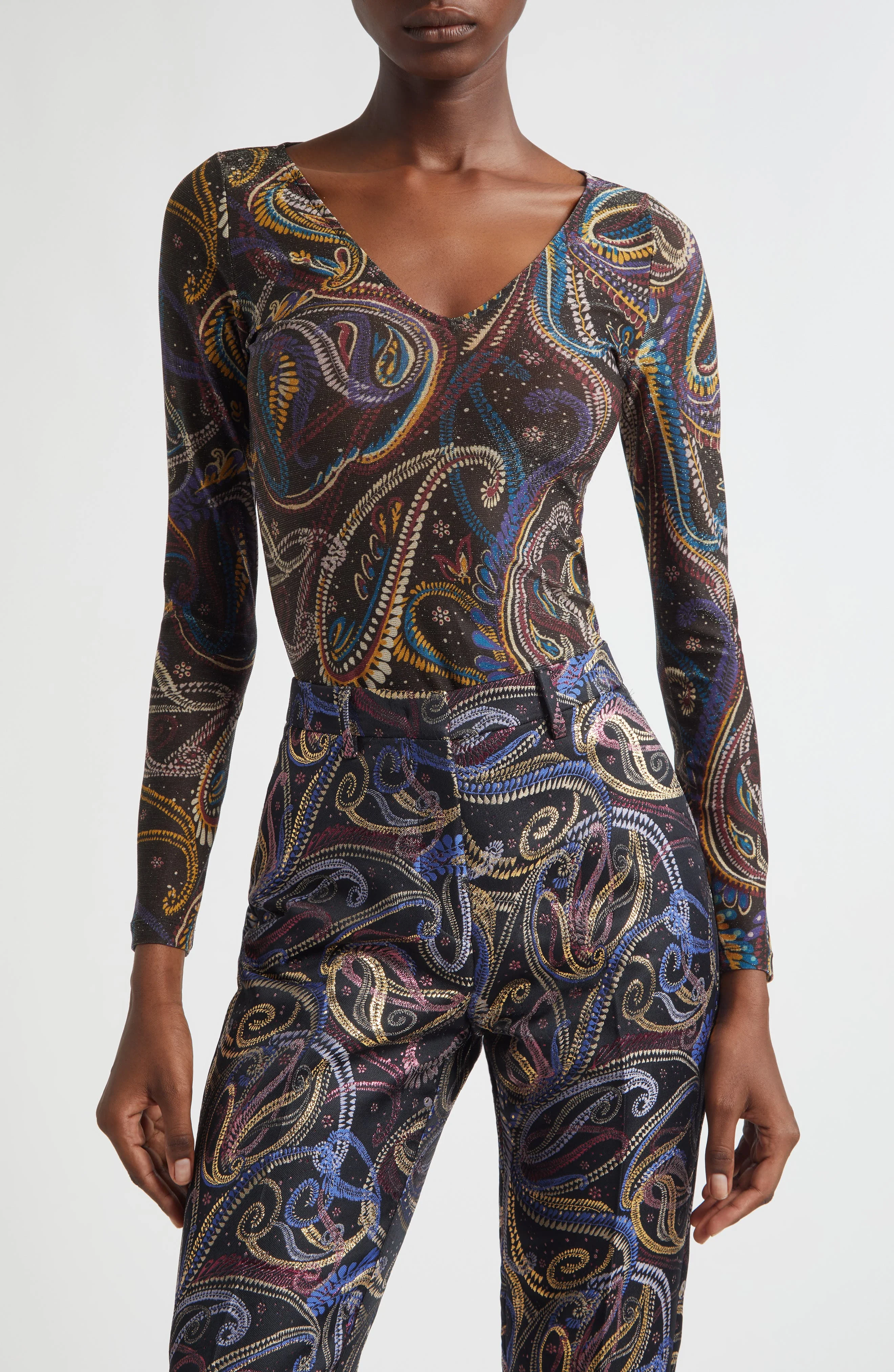 Etro tilts its quintessential boho eclecticism into nocturnal territory with this trim jersey top featuring house-signature paisley set against an inky canvas shimmered with metallic threads. V-neck Long sleeves 92% polyester, 7% elastane, 1% metallic fibers Dry clean Made in Italy Designer Clothing
