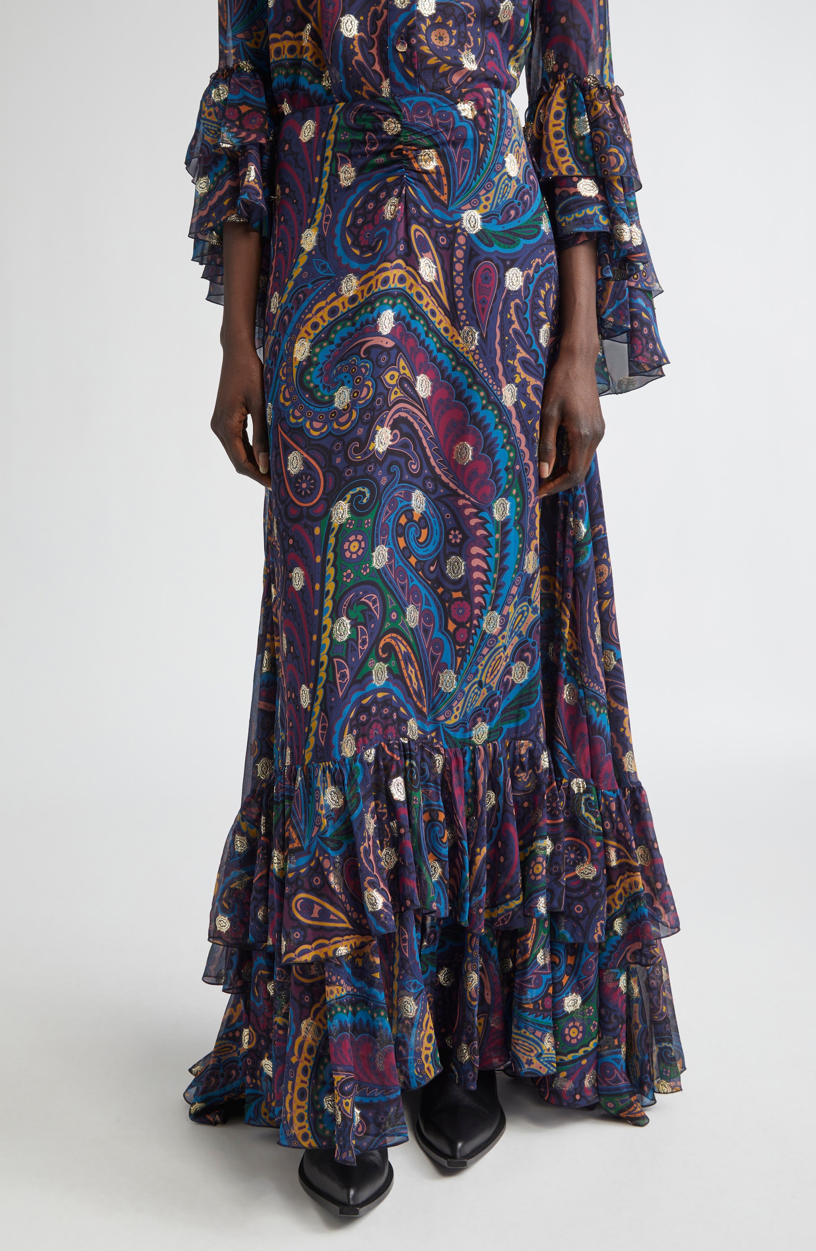 Etro brings boho glamour to the fore with this artfully gathered, ruffle-wrapped maxi skirt patterned in house-signature paisley swirls interspersed with shimmering metallic medallions. Hidden back-zip closure 98% silk, 2% metallic fibers Dry clean Made in Italy Designer Clothing