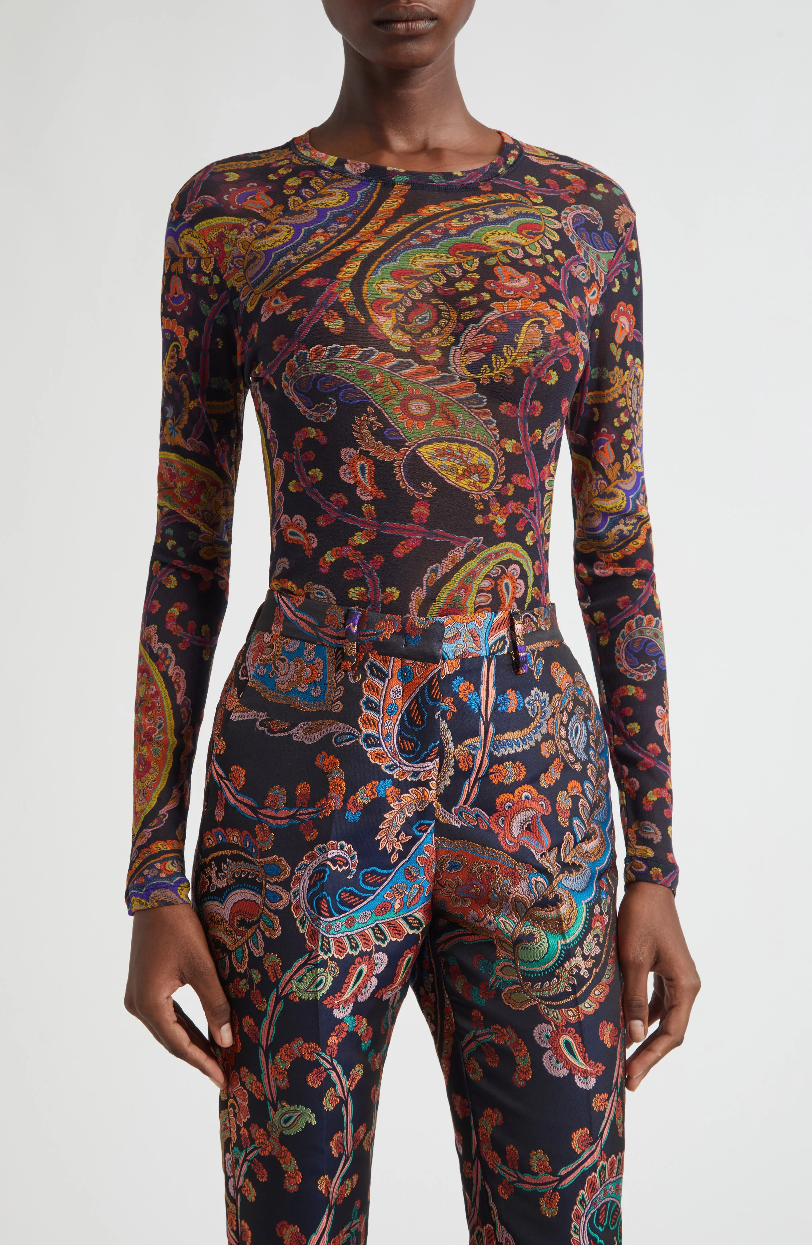 Etro's boho eclecticism defines this slim-fitting top that combines a kaleidoscopic array of signature paisley swirls with a soft, breezy mesh construction. Crewneck Long sleeves 100% polyamide Hand wash, line dry Made in Italy Designer Clothing