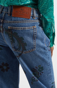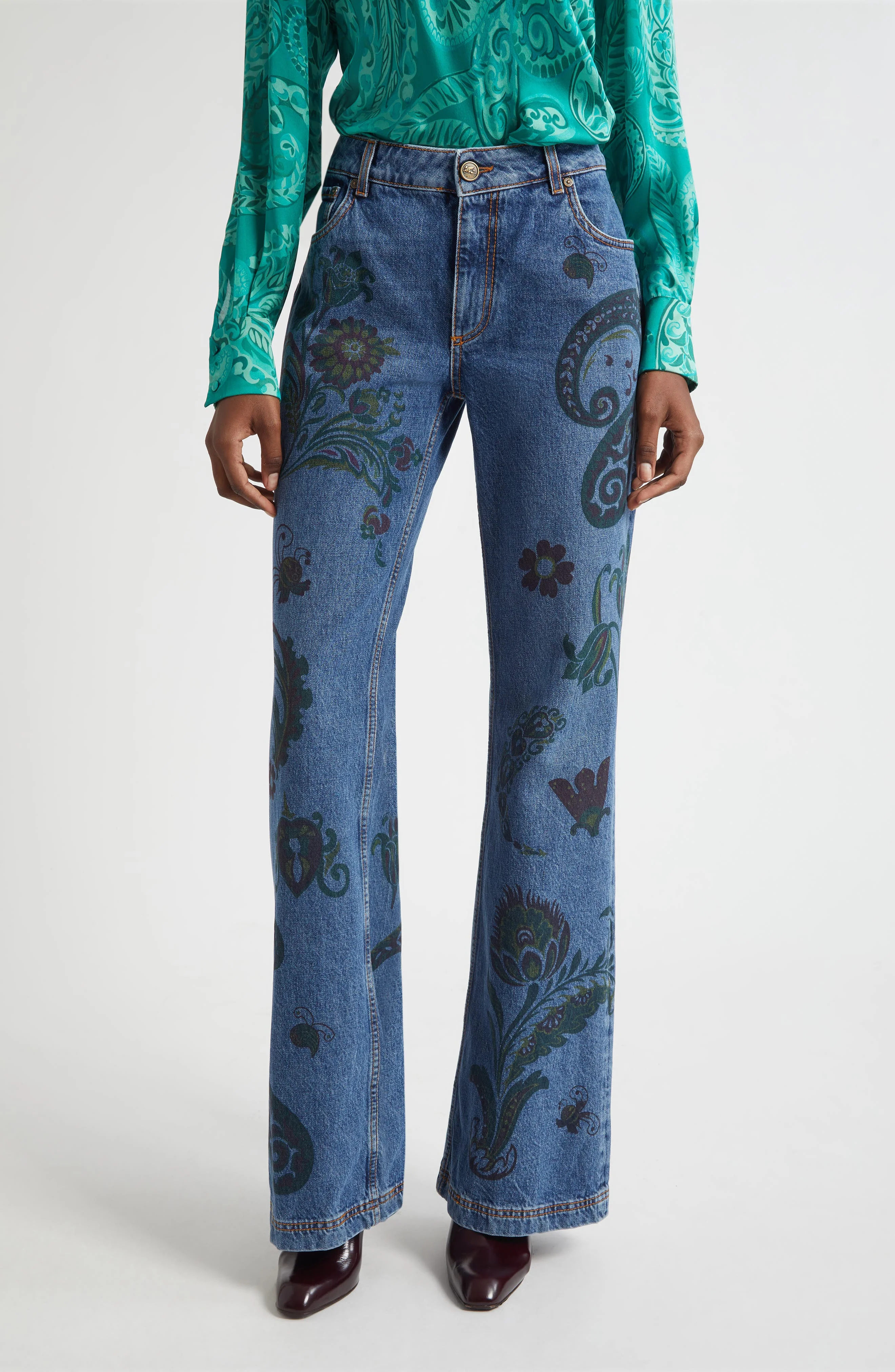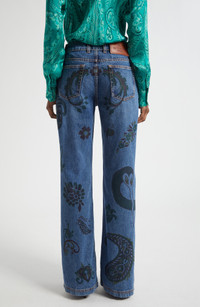 A muted print of Etro's signature paisley enhances the boho vibes of these nonstretch-denim jeans cut in a flared silhouette. Zip fly with button closure Five-pocket style 100% cotton Dry clean Made in Italy Designer Clothing