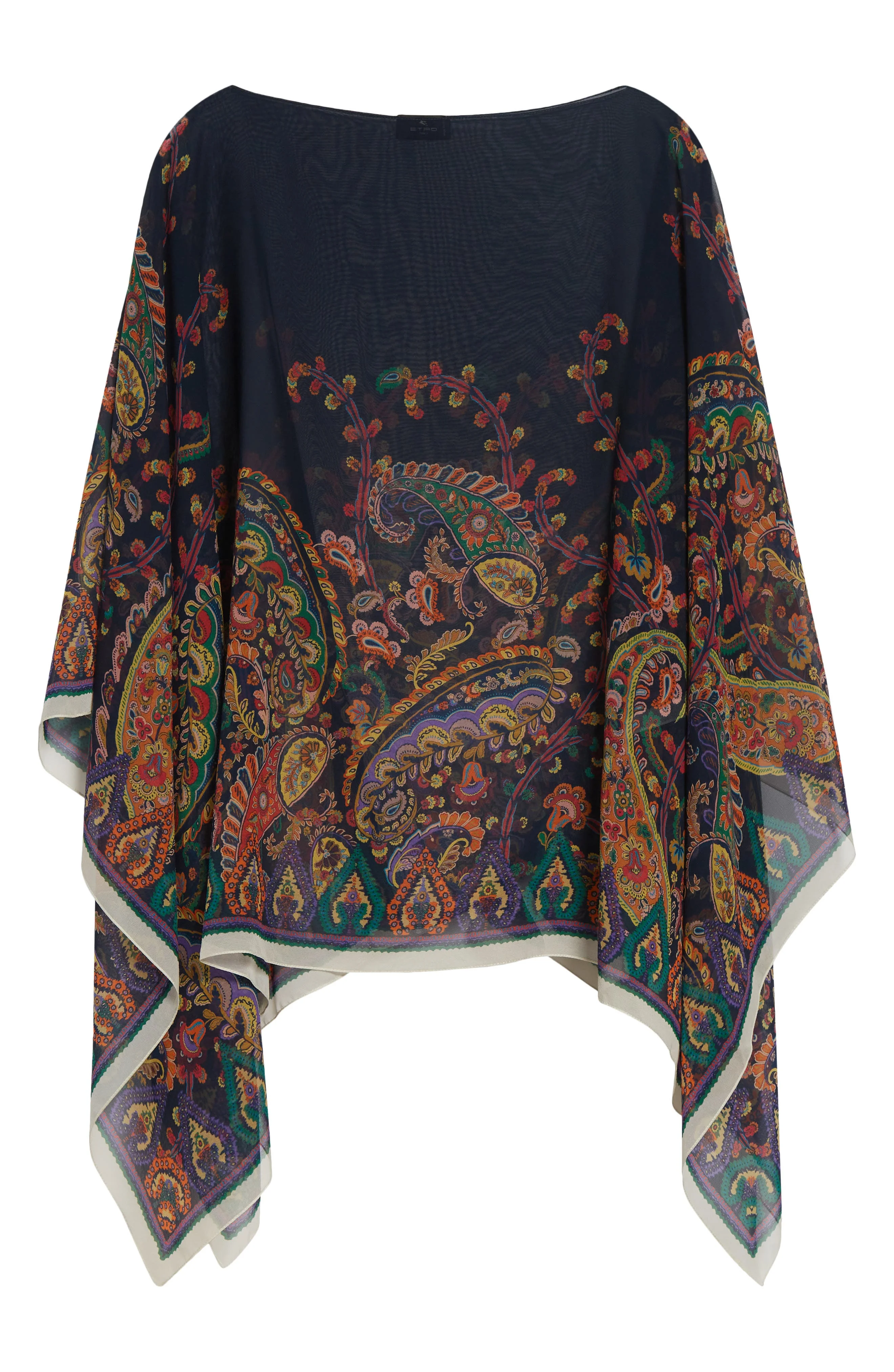Boho's back. Leading the pack, Etro serves up '70s nostalgia with house-signature paisley swirled in a kaleidoscopic array across this airy silk-chiffon poncho that gracefully sways as you walk. Bateau neck Long sleeves 100% silk Dry clean Made in Italy