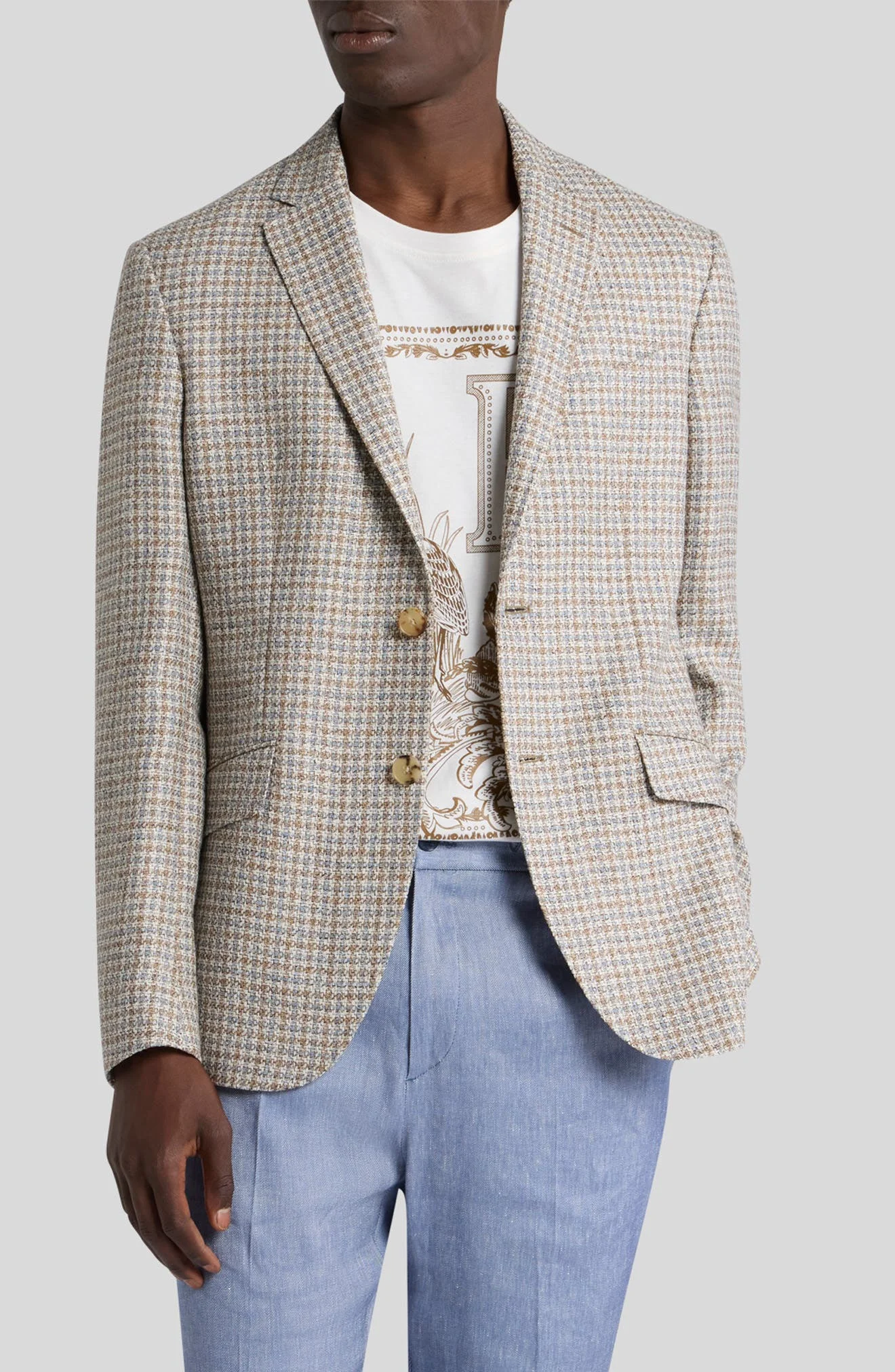 Muted hues check an Italian-made sport coat crafted from a luxe blend of wool, silk and linen. Front button closure Notched lapels Nonfunctional four-button cuffs Chest welt pocket; front flap pockets Side vents Lined 48% wool, 28% silk, 24% linen Dry clean Made in Italy