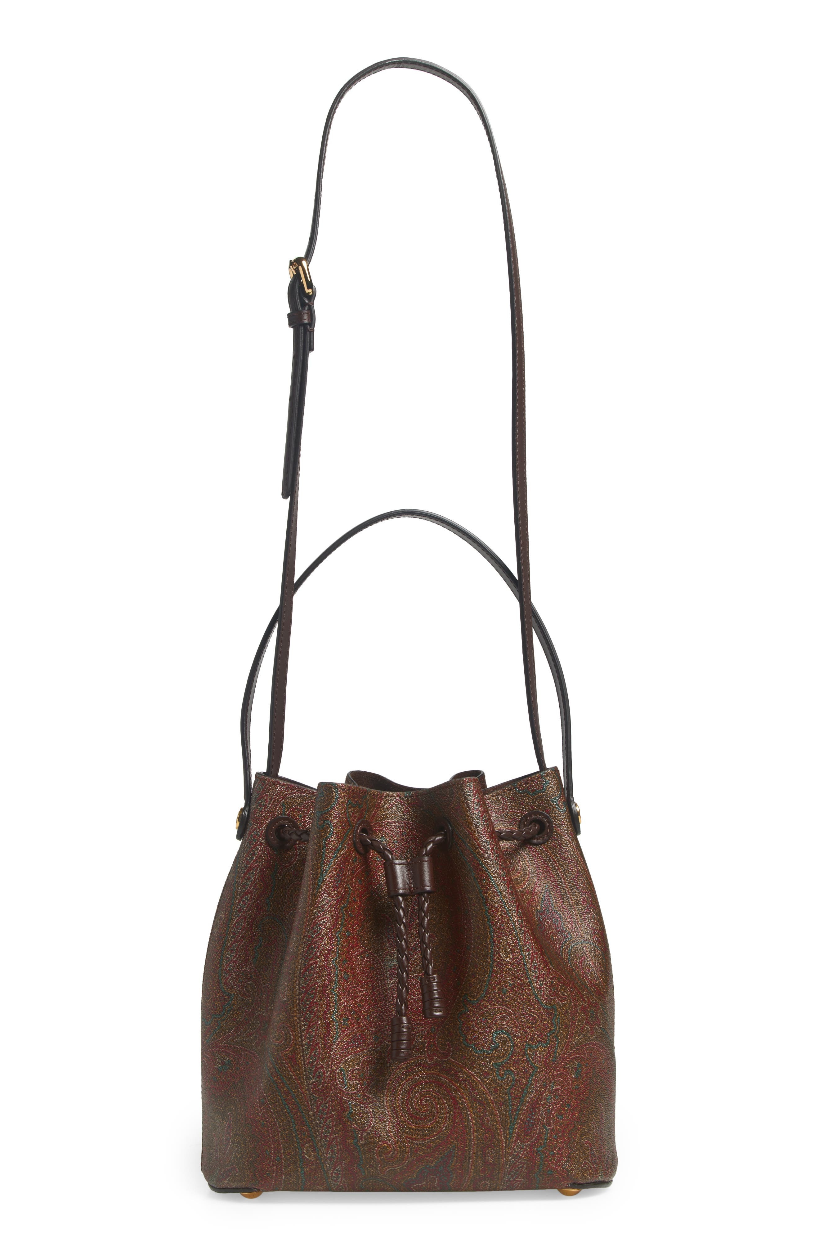 Signature paisley brings Etro's iconic energy to this coated-canvas bucket bag crafted in a scaled-down, structured silhouette with a top handle and adjustable strap for carrying versatility. Drawstring closure Top carry handle; adjustable crossbody strap Structured silhouette with flat base and protective metal feet Coated canvas with leather trim Made in Italy Designer Handbags