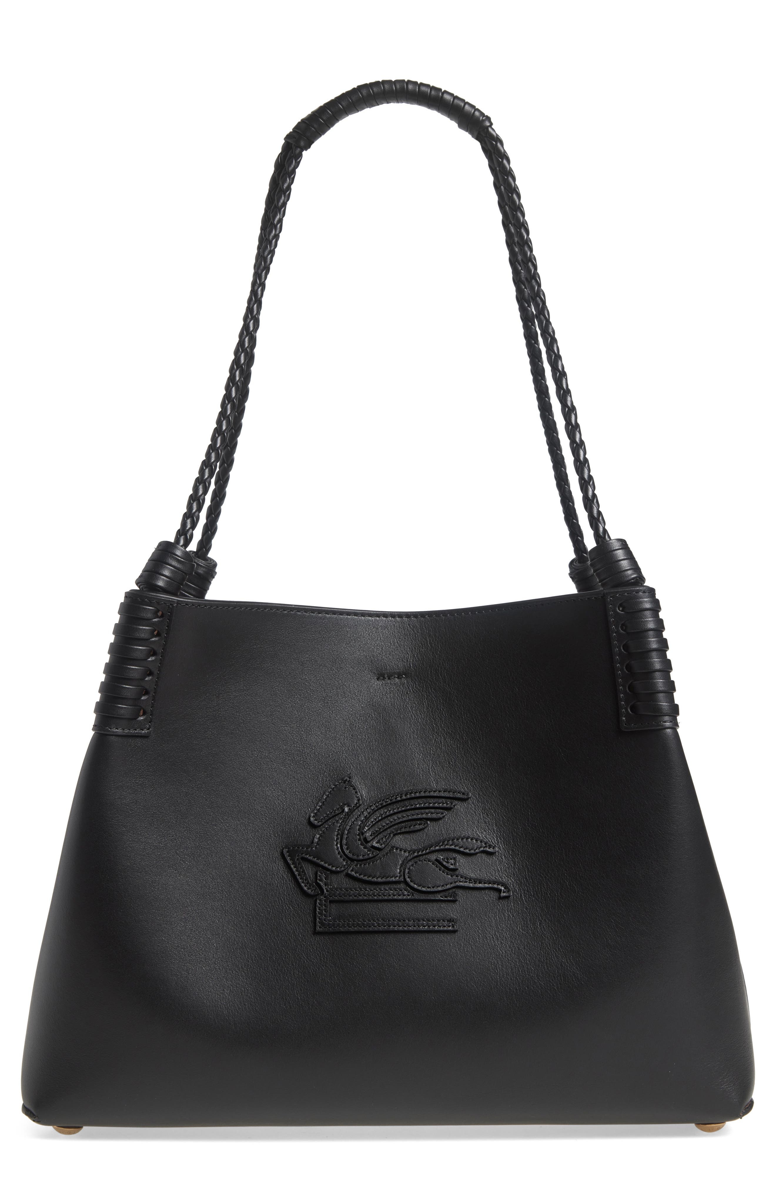 A signature Pegaso logo brings Etro's iconic energy to a softly structured leather tote packed with a removable suede pouch and finished with braided shoulder straps. Bridge-clip closure Shoulder straps Removable tethered pouch Structured silhouette with flat base and protective metal feet Suede lining Leather Made in Italy Designer Handbags