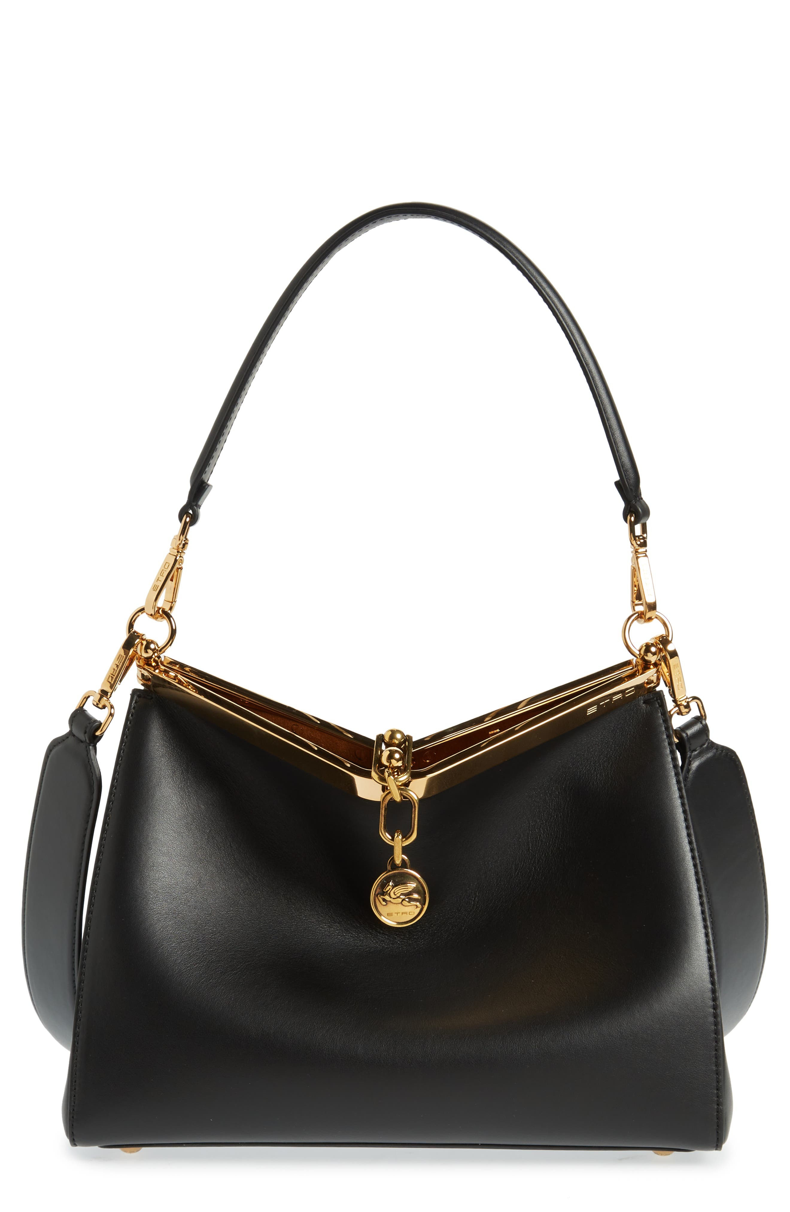 Fresh from the resort '24 runway, this Vela bag is rendered in smooth calfskin and detailed with gleaming hardware, including a coin-minted Pegaso medallion. The included suede pouch matches the bag's spacious suede interior. Slip-over bar closure Removable top carry handle; removable shoulder strap Removable zip pouch Structured silhouette with flat base and protective metal feet Suede lining Leather Made in Italy Designer Handbags