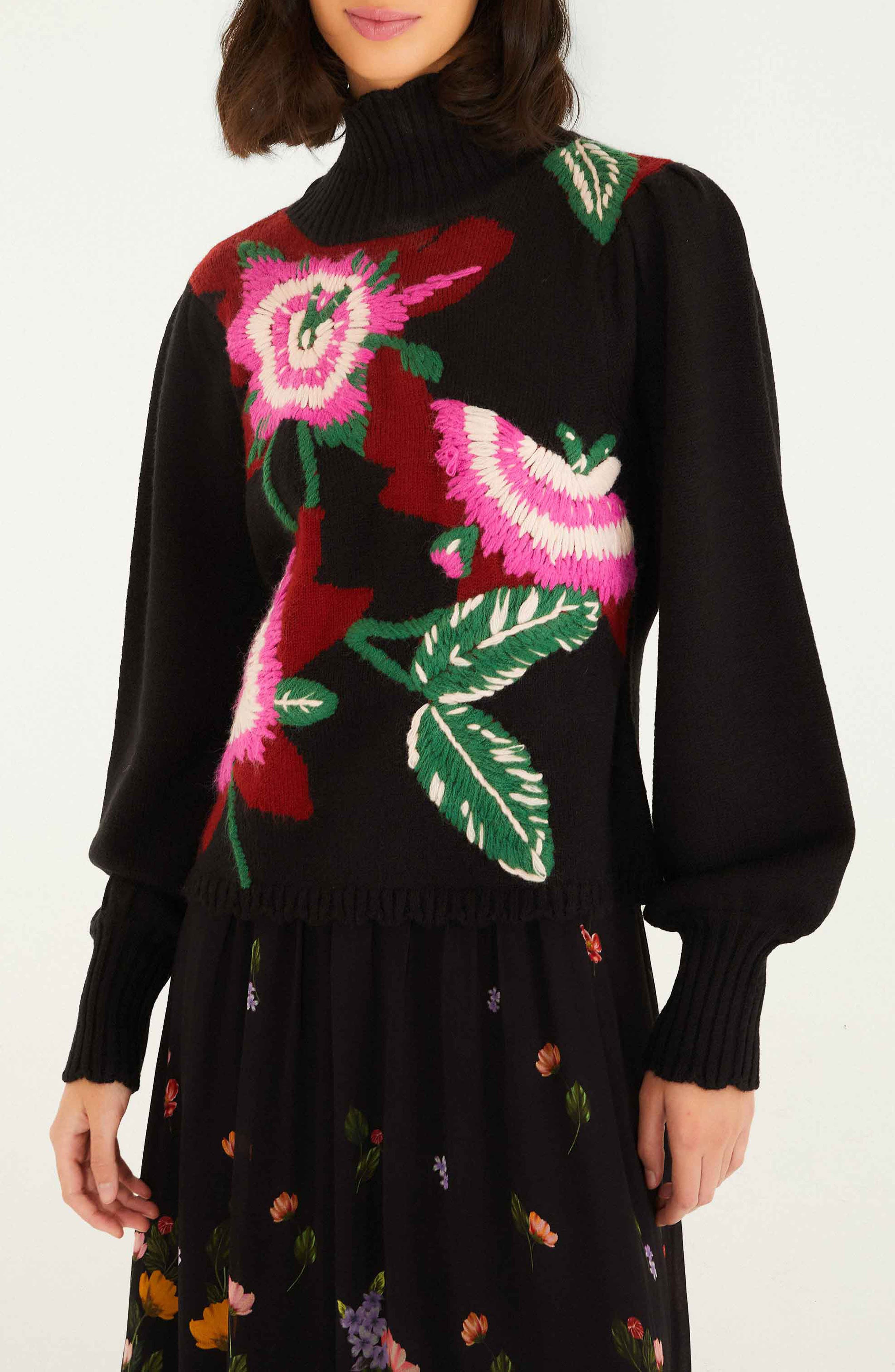 Voluminous bishop sleeves frame this woolly turtleneck sweater knit with bold blooms in signature vivid hues. Turtleneck Long sleeves Ribbed cuffs and hem 65% acrylic, 25% polyamide, 10% wool Hand wash, dry flat Imported This brand will plant one tree for every purchase of its product as a partner of the global reforestation nonprofit One Tree Planted Hispanic & Latinx Owned/Founded