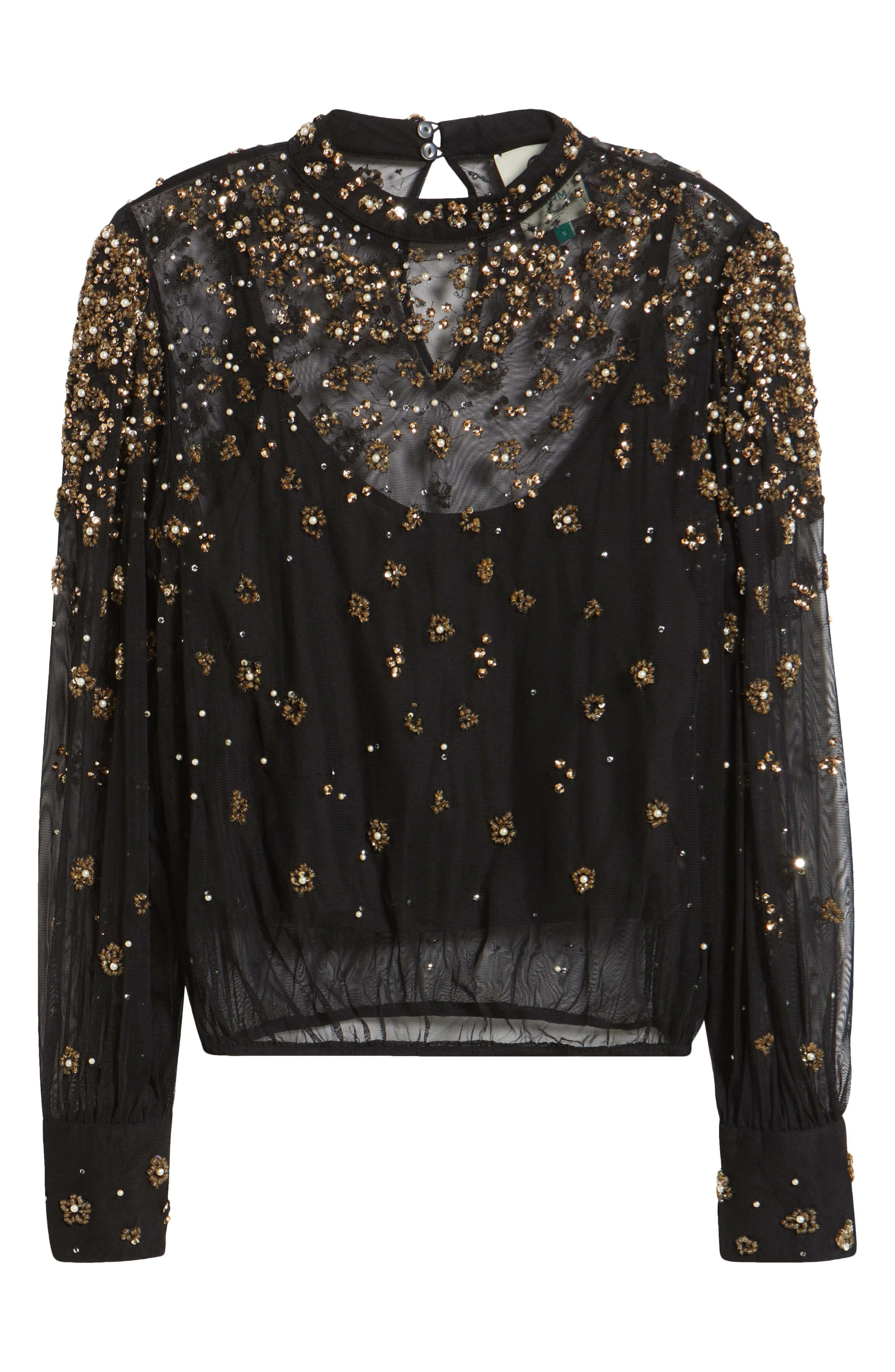 A cinched hemline creates a bubble effect in this sheer tulle top embellished with twinkling faux pearls and sequins. Back keyhole with button-and-loop closure Band collar Long sleeves with button cuffs Camisole lining 100% nylon Machine wash, tumble dry Imported This brand will plant one tree for every purchase of its product as a partner of the global reforestation nonprofit One Tree Planted Hispanic & Latinx Owned/Founded