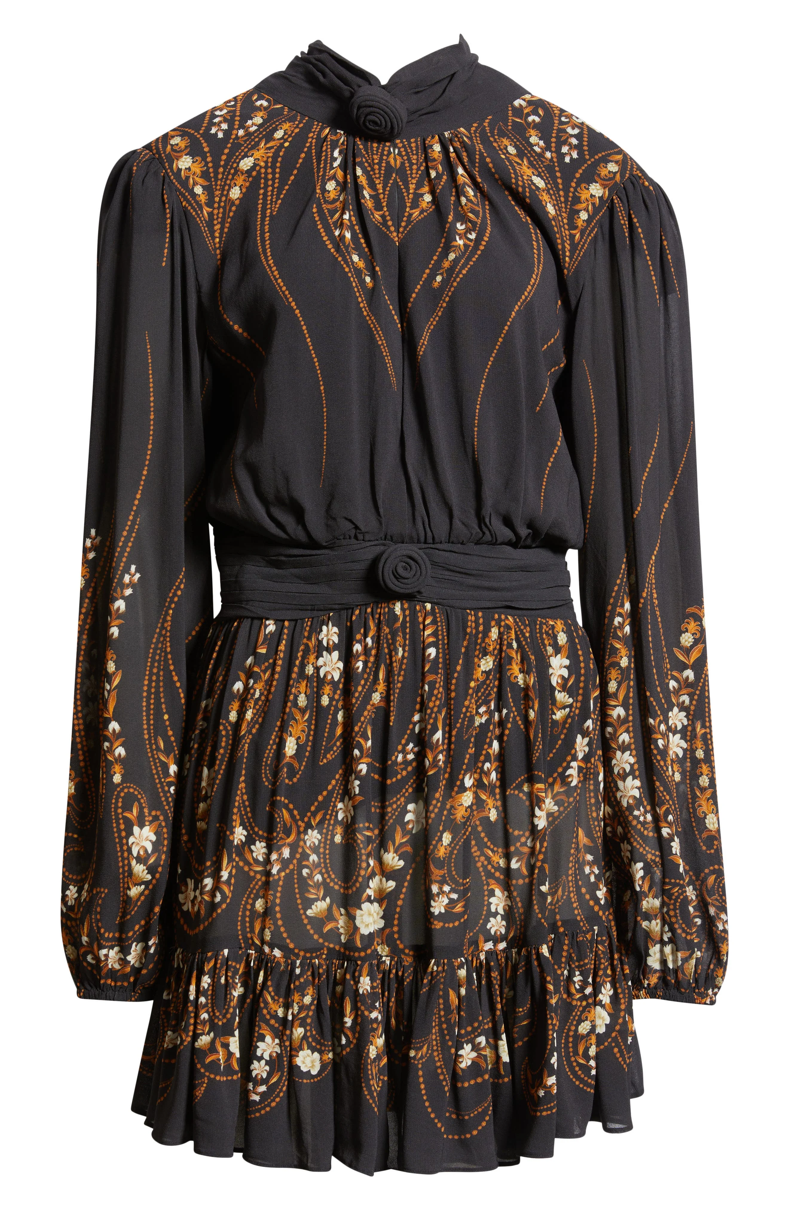 Trailing vines of blossoms and dotwork cascade over this flowy long sleeve dress featuring two dimensional rosettes. Mock neck Long sleeves with elastic cuffs Lined 100% viscose Dry clean Imported This brand will plant one tree for every purchase of its product as a partner of the global reforestation nonprofit One Tree Planted Hispanic & Latinx Owned/Founded