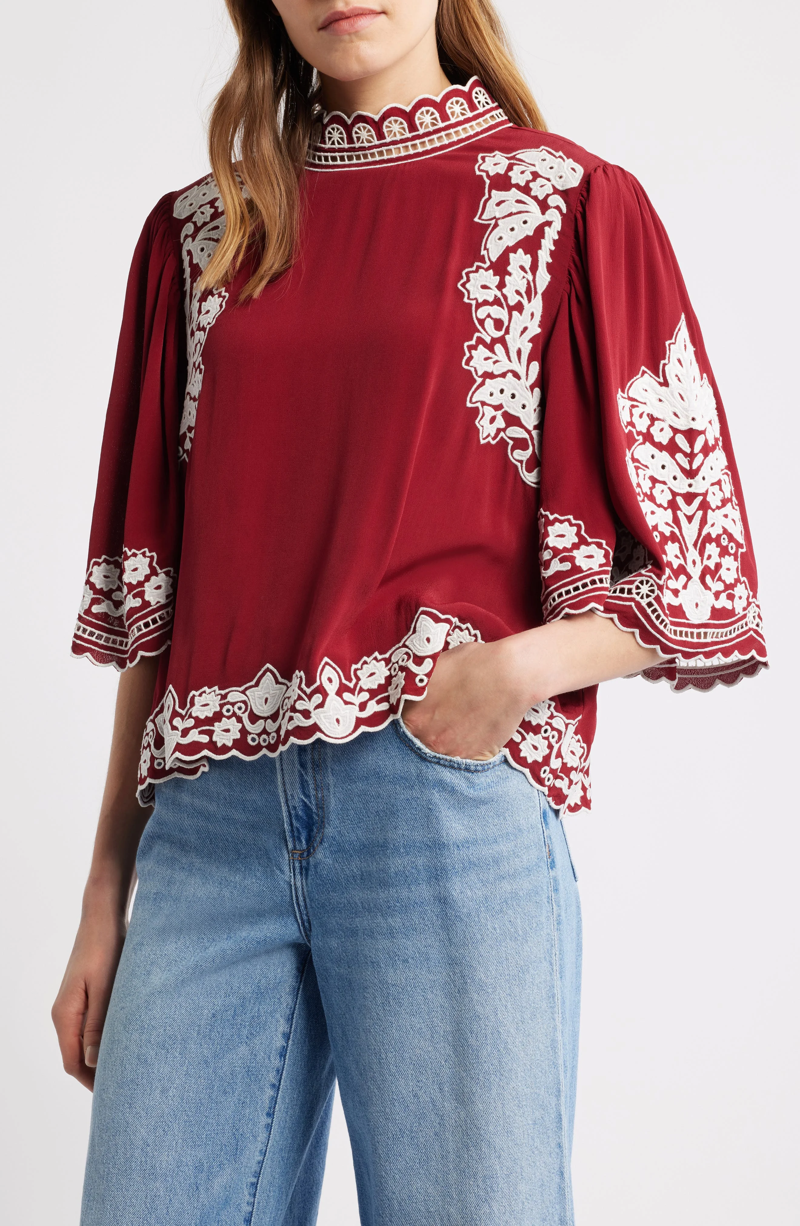 FARM Rio Palm Tree Embroidered Top in Burgundy at Nordstrom