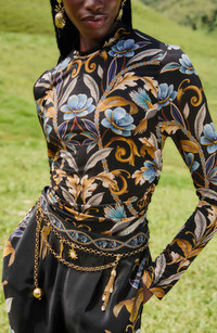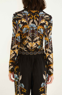 A luscious array of flora and fauna animate a stretch jersey top offered with a neat mock neck. Mock neck Long sleeves 85% viscose, 15% elastane Machine wash, line dry Made in Turkey This brand will plant one tree for every purchase of its product as a partner of the global reforestation nonprofit One Tree Planted