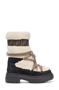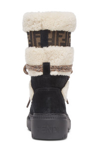 Signature FF logo jacquard brings Fendi flair to this apres ski-style boot made of genuine shearling and suede and grounded by a chunky platform sole with lug tread. Lace-up style Cushioned footbed Genuine shearling (Italy), leather and textile upper/textile lining/rubber sole Made in Italy Designer Shoes