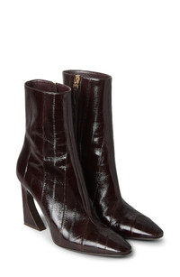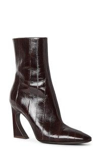 The logo-engraved hardware signature to the Arco collection is inset along the sculpturally curved and flared stiletto of this Italian-crafted bootie made from glossy genuine eel. 3 3/4" (95mm) heel Side zip closure Genuine eel (Japan) upper/leather lining and sole Made in Italy Designer Shoes