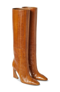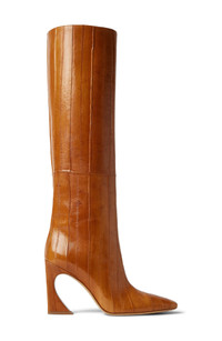 The logo-engraved hardware signature to the Arco collection is inset along the sculpturally curved and flared stiletto of this Italian-crafted knee-high boot made from glossy genuine eel. 3 3/4" (95mm) heel Side zip closure Genuine eel (Japan) upper/leather lining and sole Made in Italy Designer Shoes