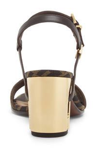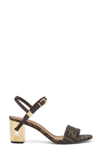 Fendi keeps the silhouette simple to let the details of this sandal steal the show. The label's FF-jacquard brings iconic branding to the look, while a slender leather ankle strap wraps through the striking cutout of the golden block heel. 2 1/2" (65mm) heel Adjustable strap with buckle closure Textile and leather upper/leather lining and sole Made in Italy Designer Shoes