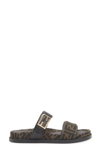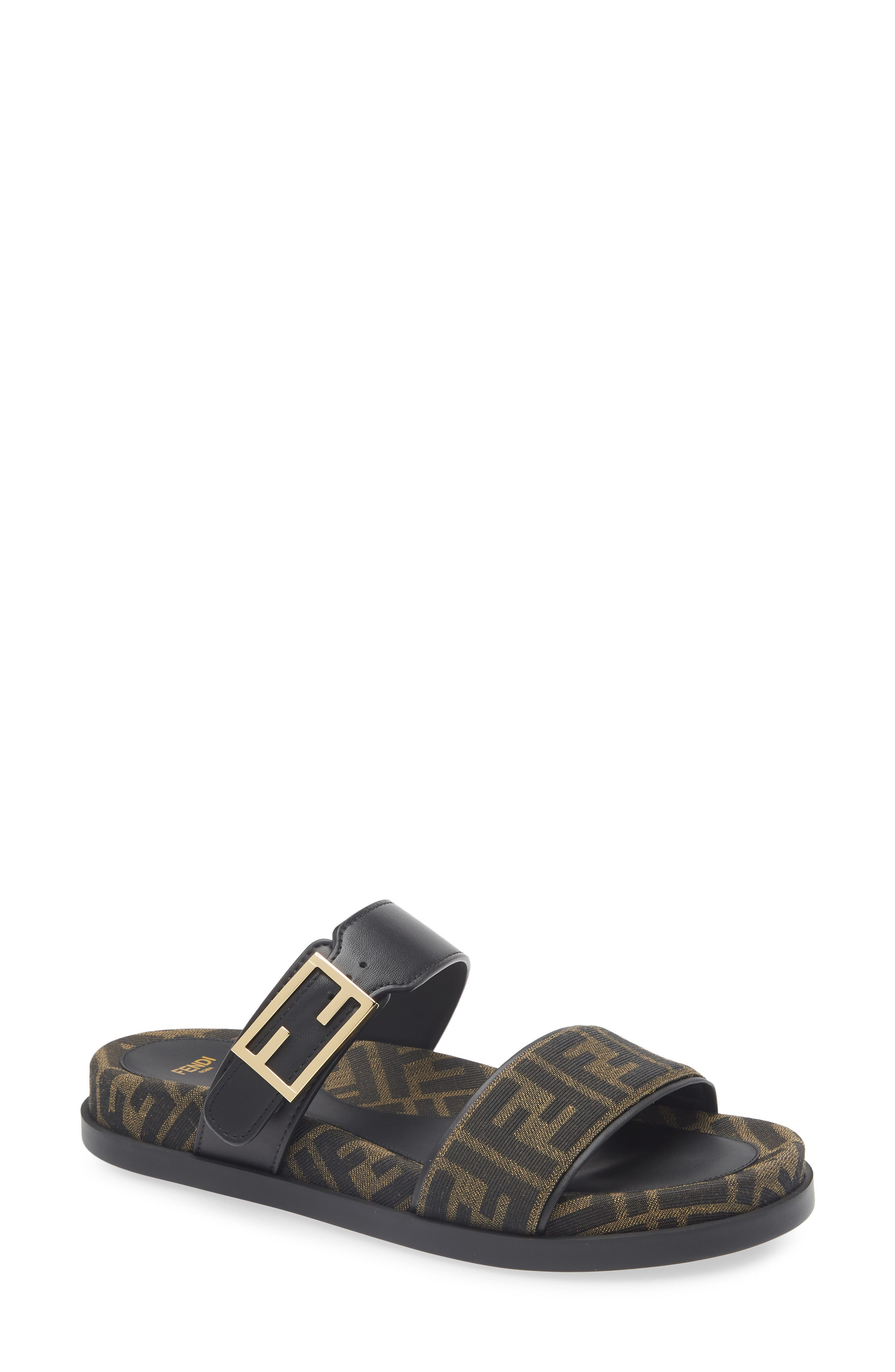 The FF-shaped buckle of the Baguette line adds a hint of glint to an Italian-crafted slide featuring a comfort-focused, molded footbed. Adjustable strap with buckle closure Contoured, cushioned footbed Leather and textile upper/leather lining/synthetic sole Made in Italy Designer Shoes