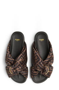 Knotted satin straps patterned with signature FF logos are cinched with logo-lettered ring hardware on this Italian-made slide sandal with a cushioned contoured footbed. Contoured cushioned footbed Textile upper/leather lining/synthetic sole Made in Italy Designer Shoes