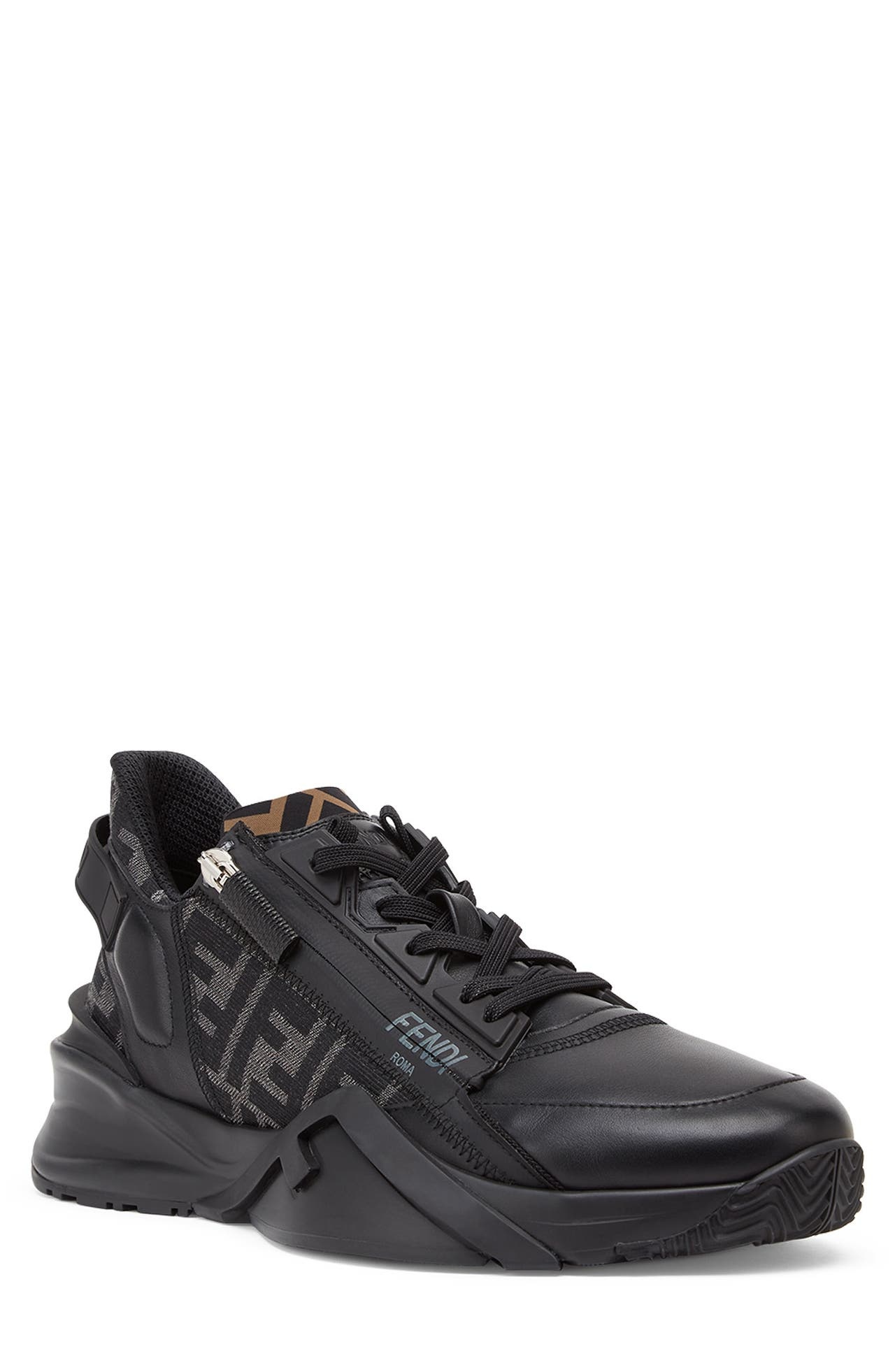 An F-molded rubber sole, logo lettering at the heel and an FF-printed sidewall add to the high-fashion flow of this mixed-media sneaker with a diagonal zip. Elastic laces; side zip closure Removable insole Leather and textile upper and lining/rubber sole Made in Italy Men's Designer Shoes