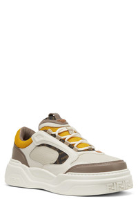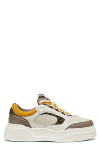 A molded rubber sole with the double-F logo at the toe boosts the fashion-forward attitude of an Italian sneaker featuring a layered mesh, leather and logo jacquard upper. Lace-up style Leather and textile upper and lining/rubber sole Made in Italy Designer Shoes