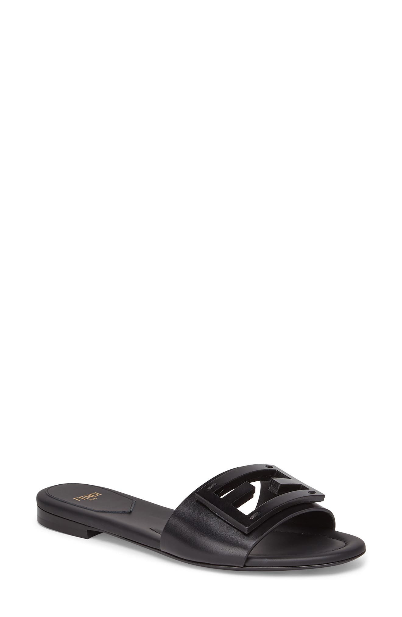 An openwork monogram buckle borrowed from Fendi's iconic baguette makes a bold statement on this leather slide sandal. Leather upper, lining and sole Made in Italy Women's Designer Shoes