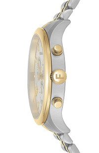 A textured guilloche dial and iconic double-Gancio symbol add signature appeal to a sophisticated chronograph watch set on a polished bracelet. 42mm case; 20mm band width Butterfly clasp closure Three-hand Swiss quartz movement Date window Sapphire crystal face Guilloche dial Stainless steel/goldtone plate Swiss made