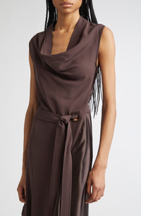 Drape and sheen vie for feature status on this mixed-media dress created in a collage of elegant asymmetries and tethered by a self-belt threaded through a leather-framed Gancio cutout. Slips on over head Cowl neck Sleeveless Attached belt Asymmetric hem 97% viscose, 3% elastane Dry clean Made in Italy Designer Clothing