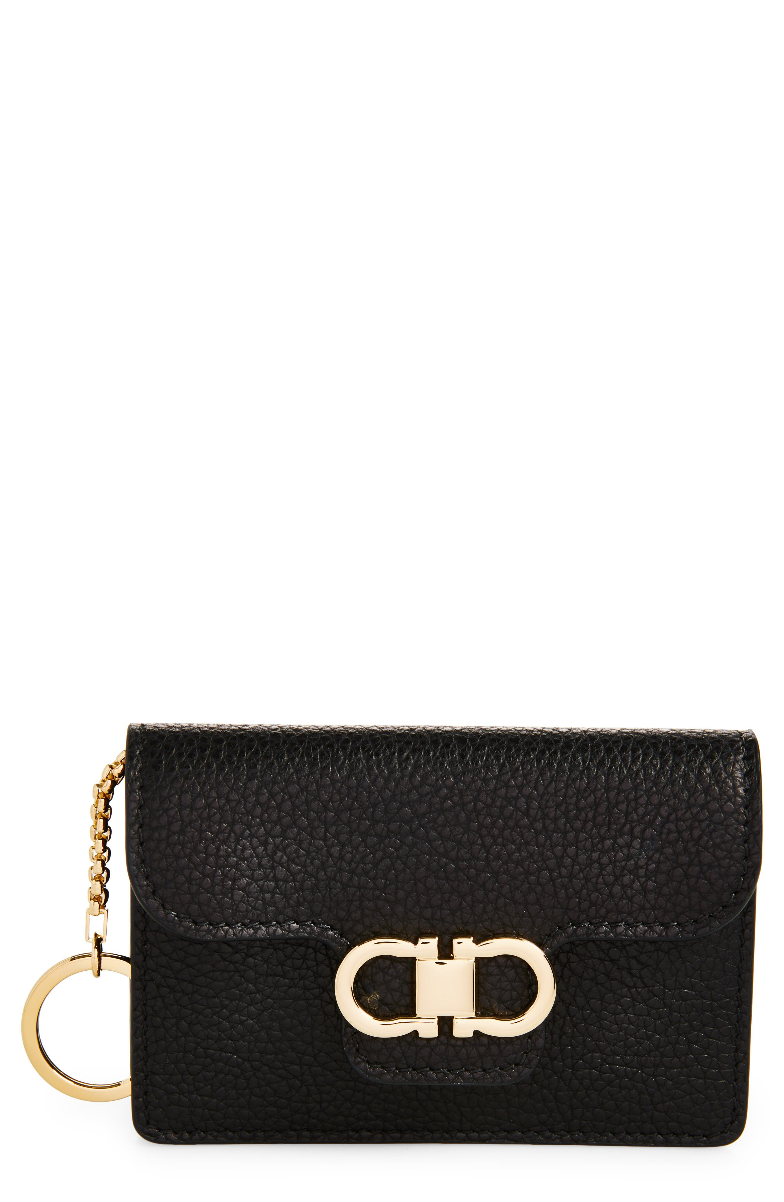 Keep keys and cards securely, stylishly handy with this grained-calfskin key case augmented with exterior card slots and a gleaming double Gancio on the snap flap. Snap-flap closure Two exterior card slots Tethered key ring Leather/textile lining Leather Designer Handbags