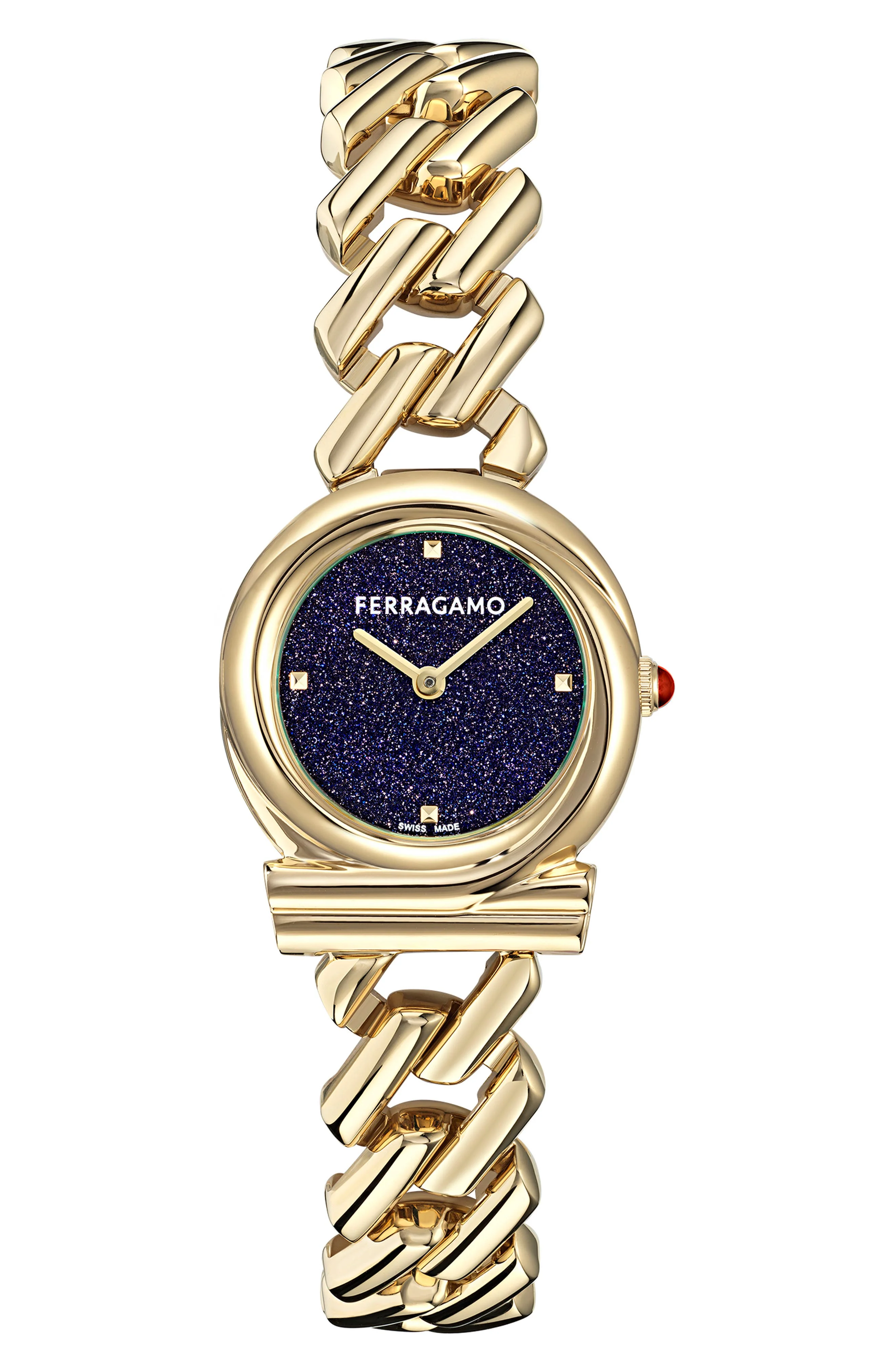 The iconic Gancio logo is twisted into a gleaming bezel for this simple yet stunning watch featuring a semiprecious stone dial and a cabochon-capped crown.Measurements: 28mm case; 14mm band width.Strap/closure: Bracelet strap with jewelry clasp closure.Movement: Two-hand Swiss RONDA 772 quartz movement. Quartz movement: powered by a battery and features an internal electrical circuit to control the rate of the watch's ticking.Other features: Malachite, blue sandstone or tiger's eye dial.Face: Sapphire crystal face. Stainless steel/goldtone plate/malachite or blue sandstone or tiger's eye Swiss made