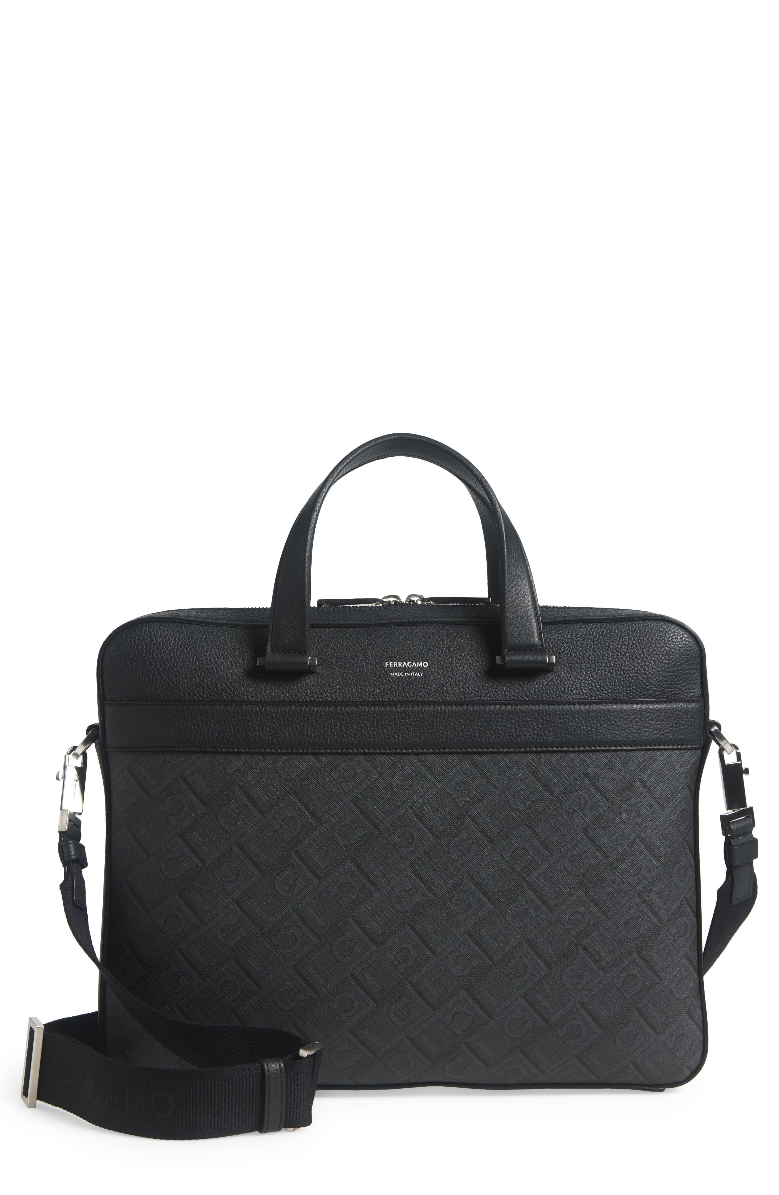Embossed Gancios bring signature Ferragamo flair to this mixed-media briefcase featuring a well-organized interior, with space for personal items as well as electronic devices. A removable shoulder strap offers an added carrying option. Two-way top-zip closure Top carry handles; removable, adjustable shoulder strap Exterior slip pockets Interior zip pocket; wall pockets Textile/leather Made in Italy