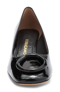 Signature Gancio detailing brings tonal branding to a block-heel pump meticulously fashioned from high-gloss patent leather. Leather upper, lining and sole Made in Italy Designer Shoes