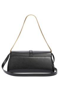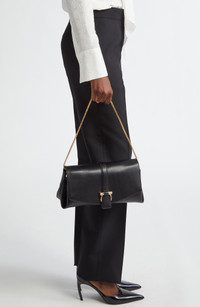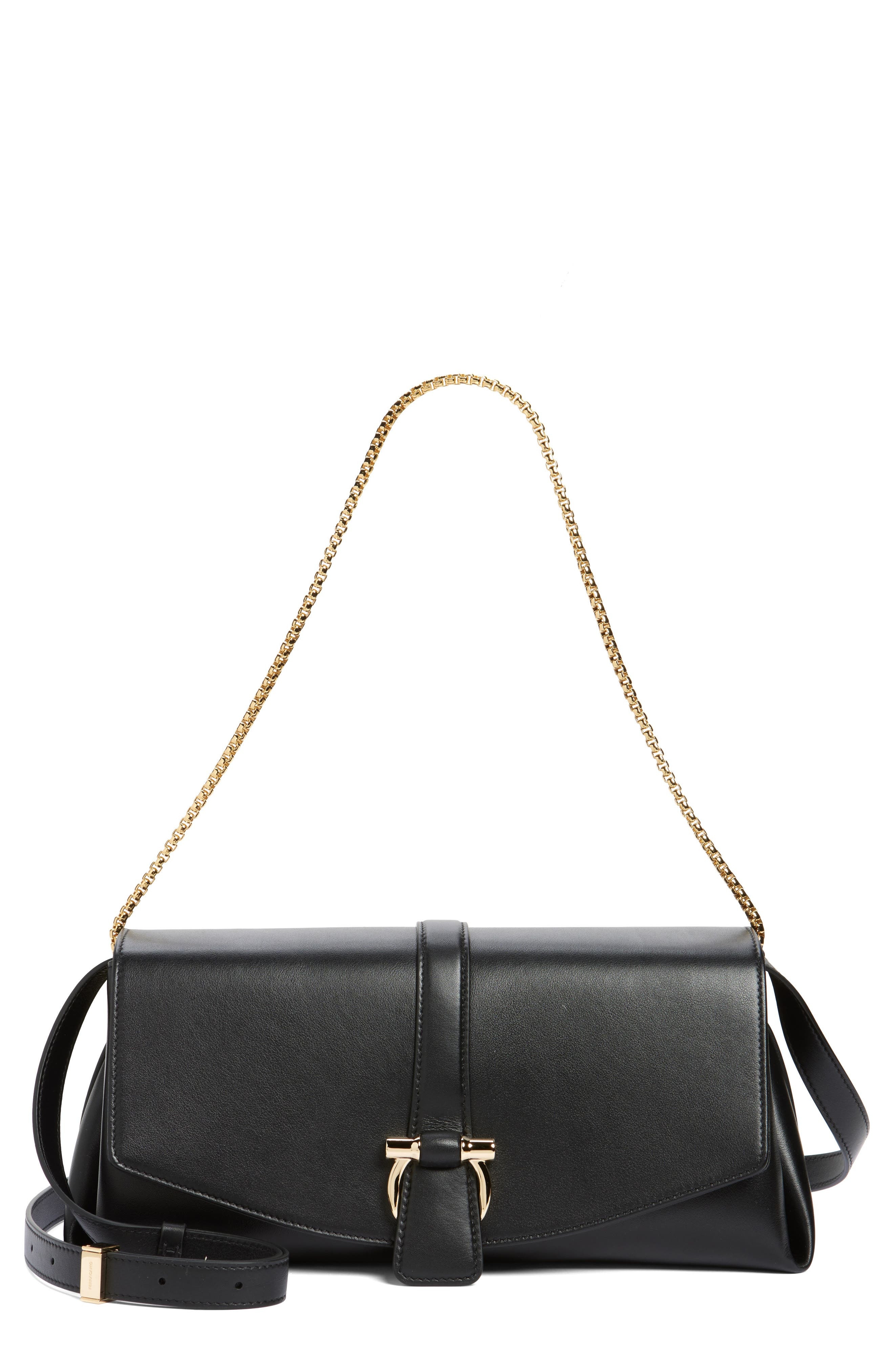 A golden Gancio clasp punctuates the front flap of this contemporary shoulder bag that's crafted in Italy from semigloss calfskin leather. Custom golden tabs shape the bellows for an outline that echoes a lily, the symbol of Florence. The versatile style comes with removable chain and leather straps, allowing you to carry it as a clutch, on the shoulder or crossbody. Snap-flap closure Removable chain strap; removable, adjustable crossbody strap Dual interior compartments with center divider; zip pocket Leather Made in Italy Designer Handbags