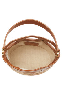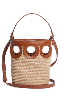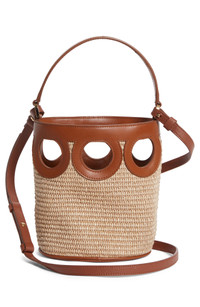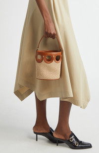 Smooth leather contrasts beautifully with woven raffia on this compact bucket bag punctuated with cutouts in Ferragamo's iconic Gancio motif. Open top Top carry handle; adjustable crossbody strap Raffia/leather Made in Italy Designer Handbags