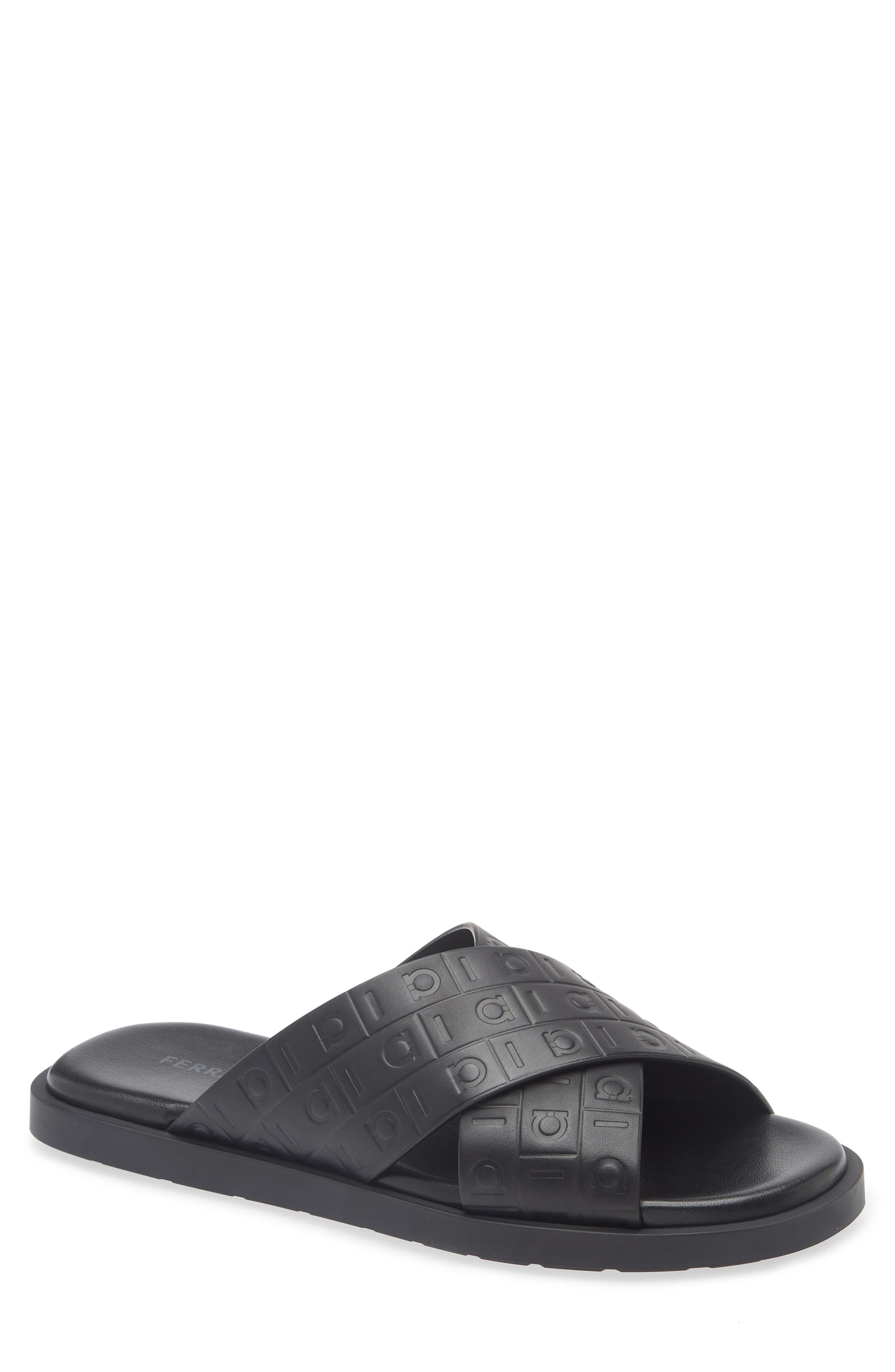 Wide crossover straps embossed with Ferragamo's iconic Gancio monogram bring subtle branding to this lightly padded slide sandal with an ultralight rubber sole. Padded footbed Leather upper and lining/rubber sole Made in Italy Designer Shoes