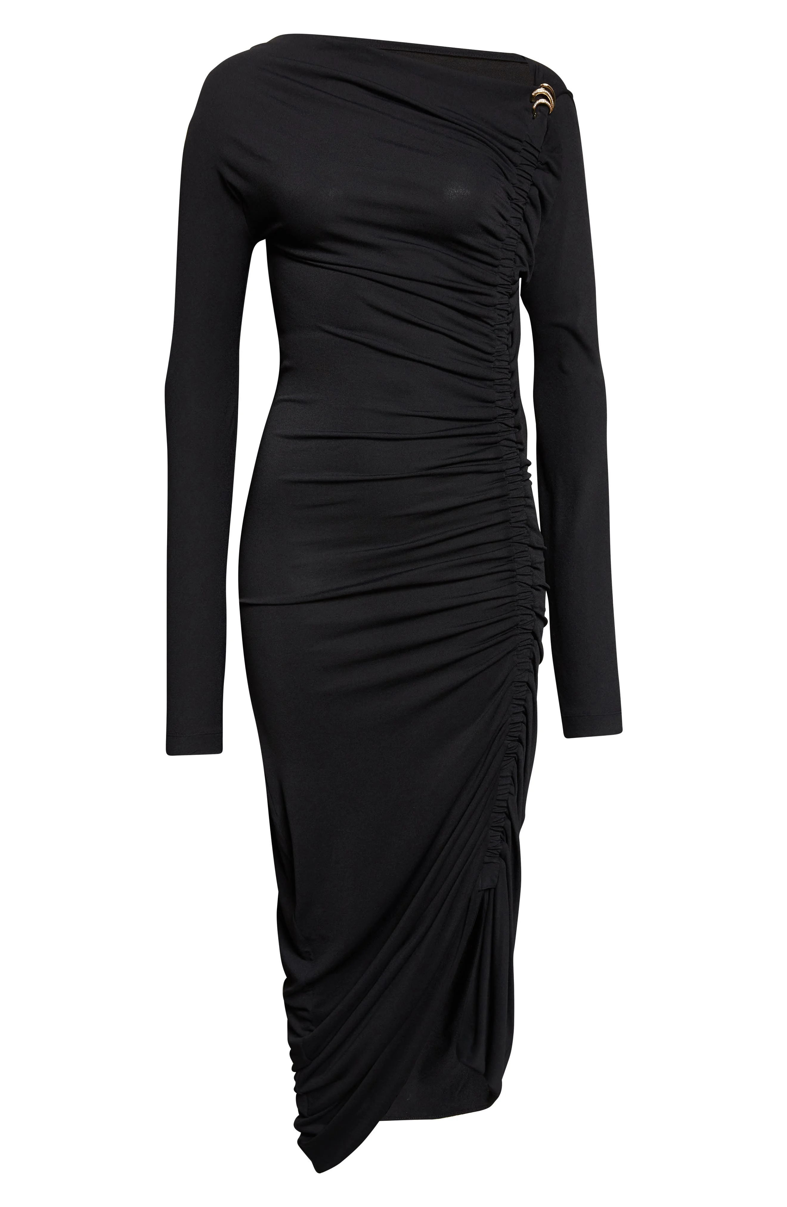 Ruched folds that run the entire length shape the curve-hugging fit of this long-sleeve dress made from slinky stretch-enhanced jersey and finished with an asymmetric hem. A crystal-embellished claw brooch brings sophisticated sparkle and shine to the shoulder-baring neckline. Asymmetric bateau neck Long sleeves Side slit 78% viscose, 17% polyamide, 5% elastane Dry clean Made in Italy Designer Clothing