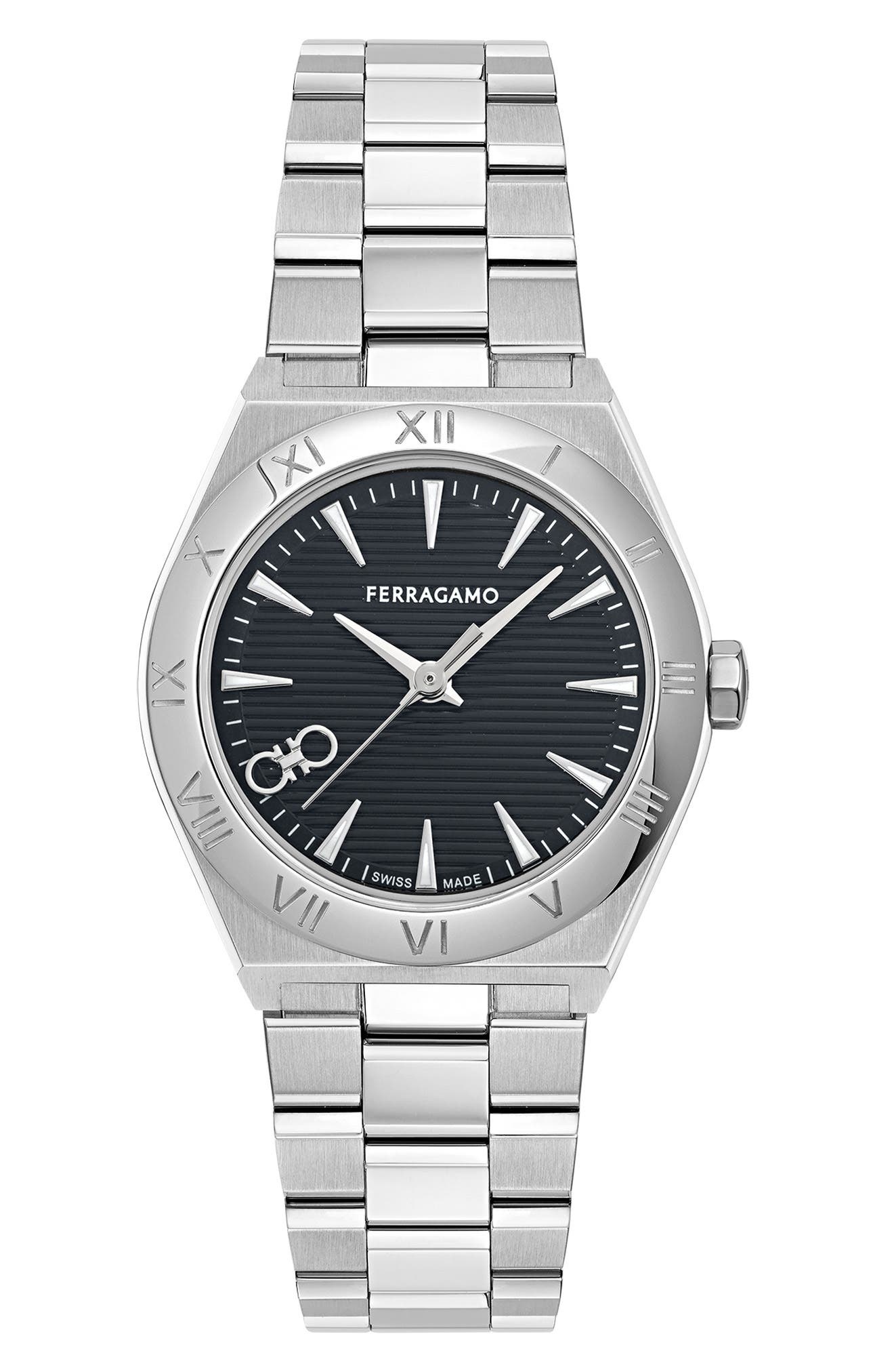 A striped-guilloche dial with a double-Gancio logo adds Ferragamo's sophisticated DNA to this poised and precise timepiece in a mix of polished and brushed stainless steel. Made with pairing potential, this women's style has a twinned men's style (sold separately).Measurements: .Strap/closure: Bracelet strap with deployant clasp closure.Movement: Three-hand Swiss quartz movement. Quartz movement: powered by a battery and features an internal electrical circuit to control the rate of the watch's ticking.Other features: Stripe-guilloche dial.Face: Sapphire crystal face. Stainless steel Swiss made