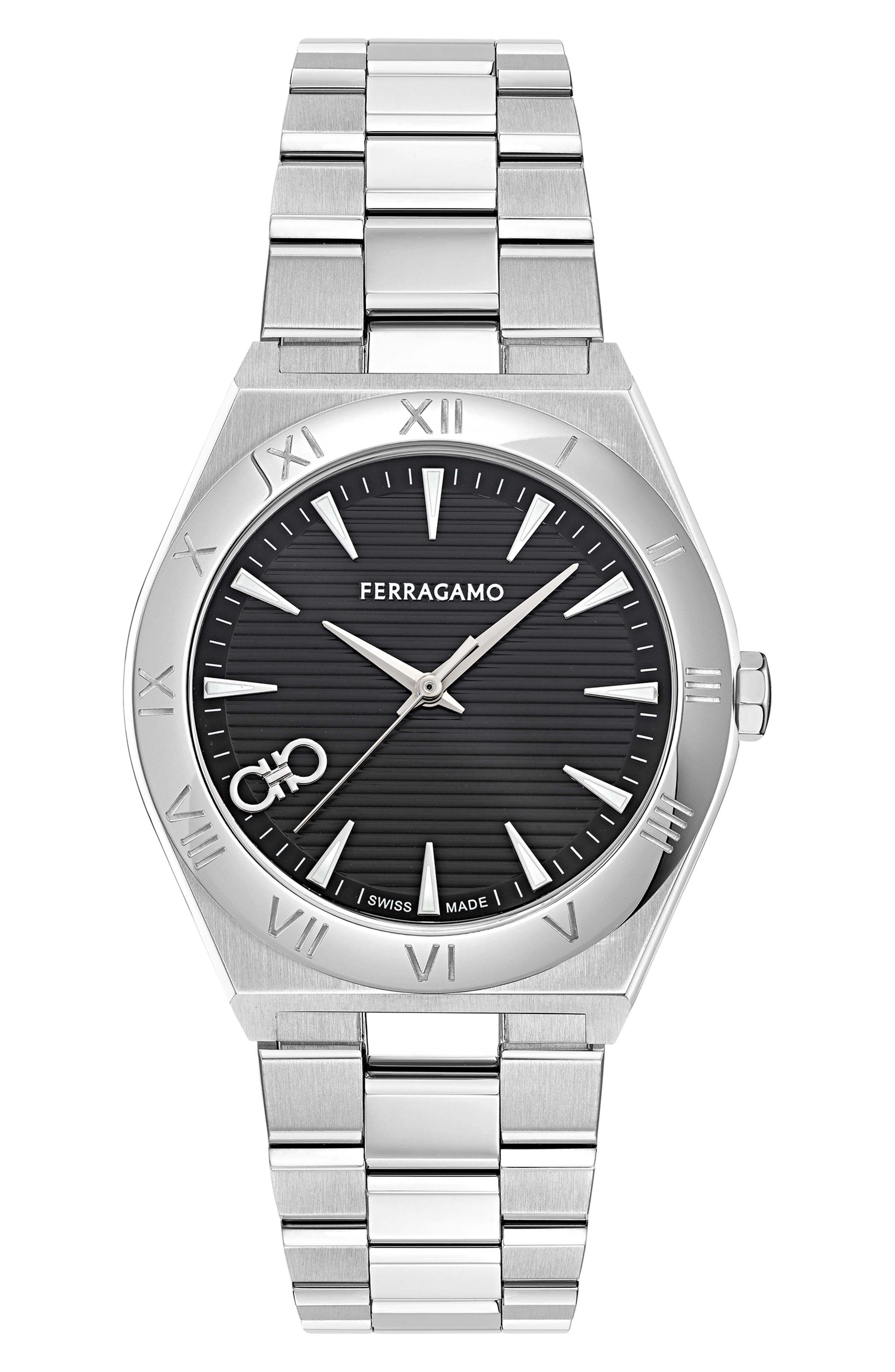 A striped-guilloche dial with a double-Gancio logo adds Ferragamo's sophisticated DNA to this poised and precise timepiece in a mix of polished and brushed stainless steel. Made with pairing potential, this men's style has a twinned women's style (sold separately).Measurements: 40mm case; 20mm band width.Strap/closure: Bracelet strap with deployant clasp closure.Movement: Three-hand Swiss quartz movement. Quartz movement: powered by a battery and features an internal electrical circuit to control the rate of the watch's ticking.Other features: Stripe-guilloche dial.Face: Sapphire crystal face. Stainless steel Swiss made