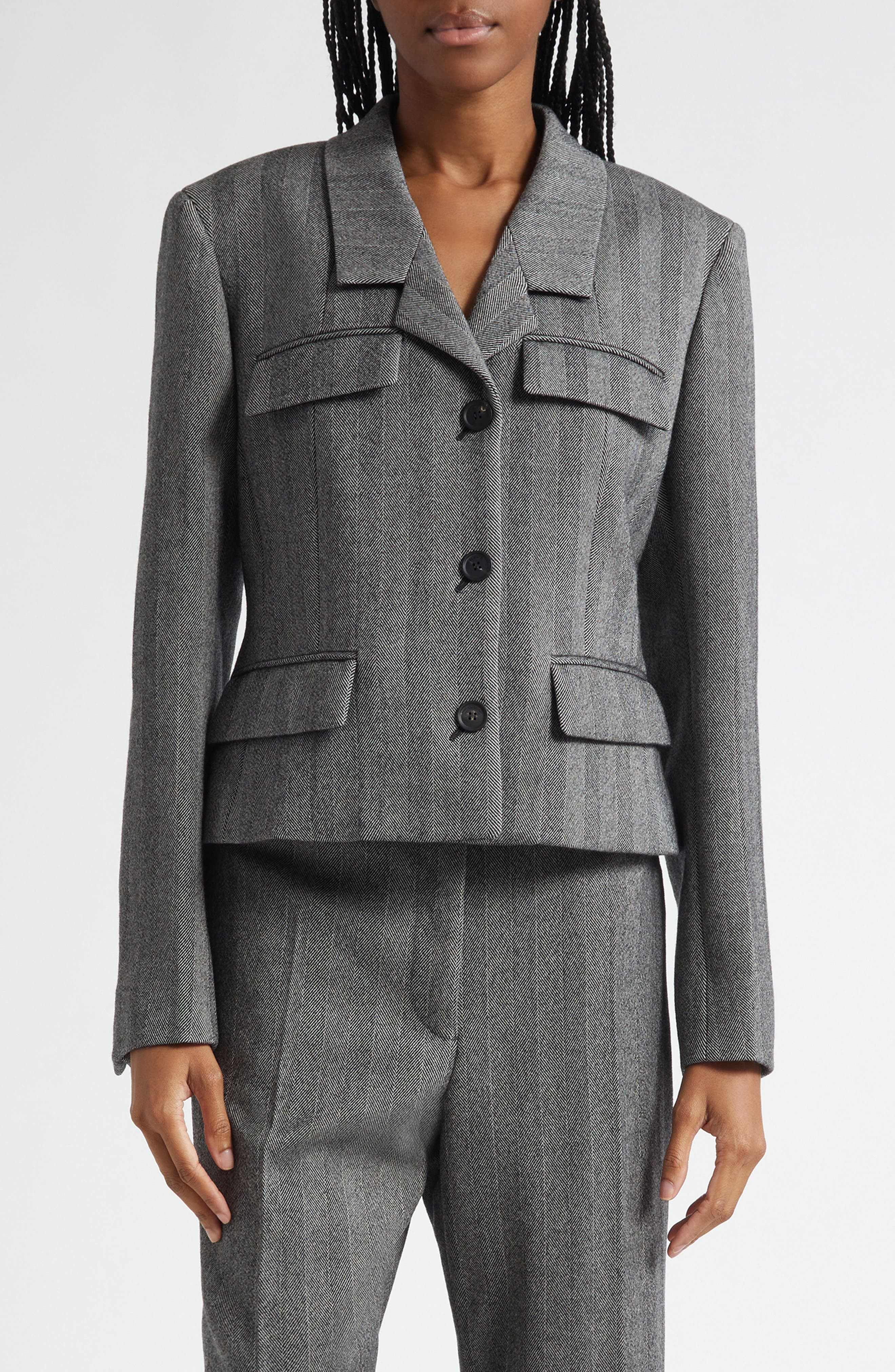A dimensional herringbone weave brings sartorial polish to this peaked-lapel jacket tailored in a cropped silhouette from a virgin-wool blend. Front button closure Peaked lapels One-button cuffs Chest flap pockets; front flap pockets Lined 92% virgin wool, 6% polyamide, 2% elastane Dry clean Made in Italy Designer Clothing