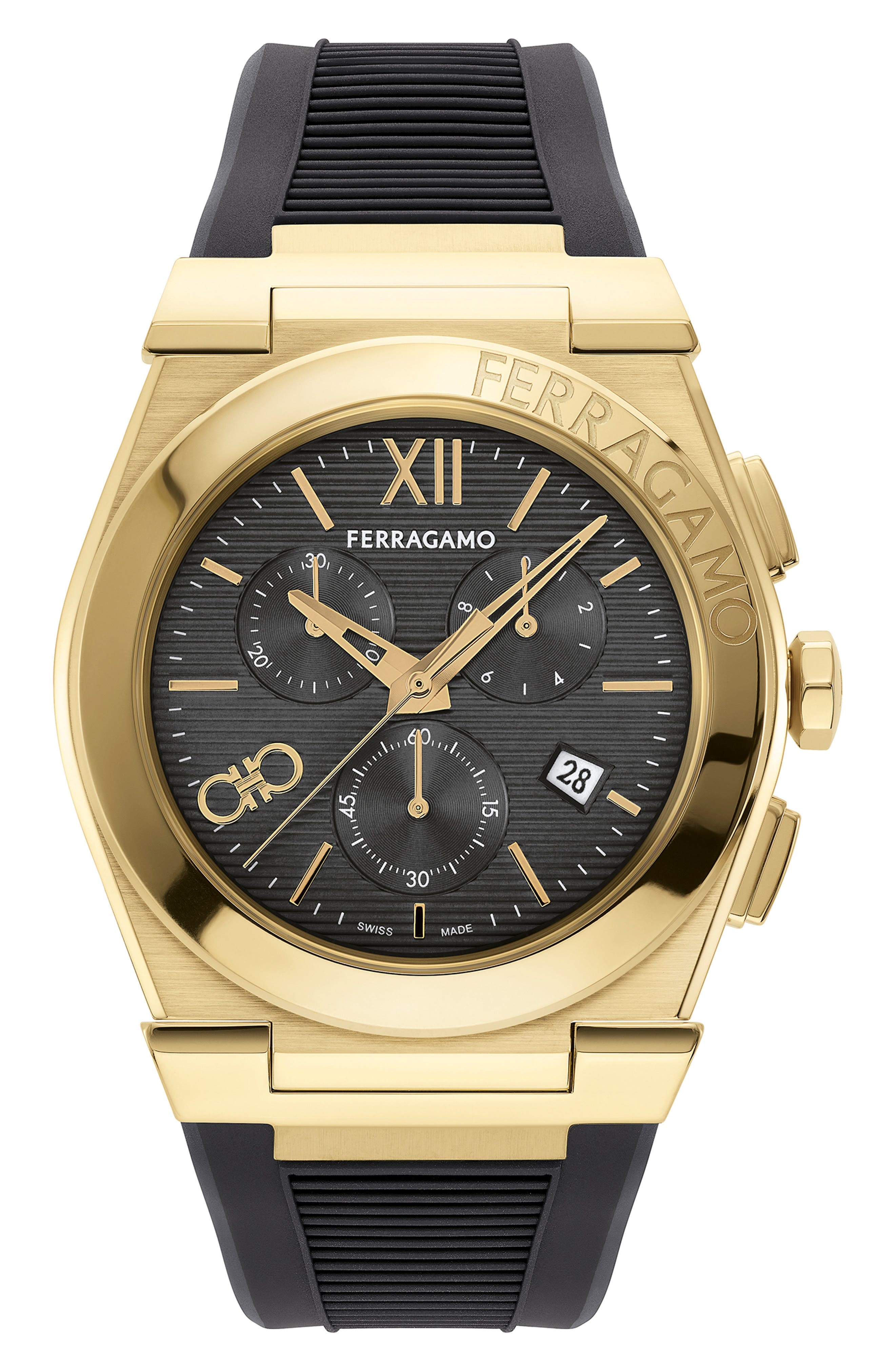 A trio of sunray subdials brings precision and functionality to a silicone strap watch designed with a date window and eye-catching details. 42mm case; 17mm band width Buckle closure Swiss quartz movement Date window Sapphire crystal face Stainless steel with ion gunmetal plate/silicone Swiss made
