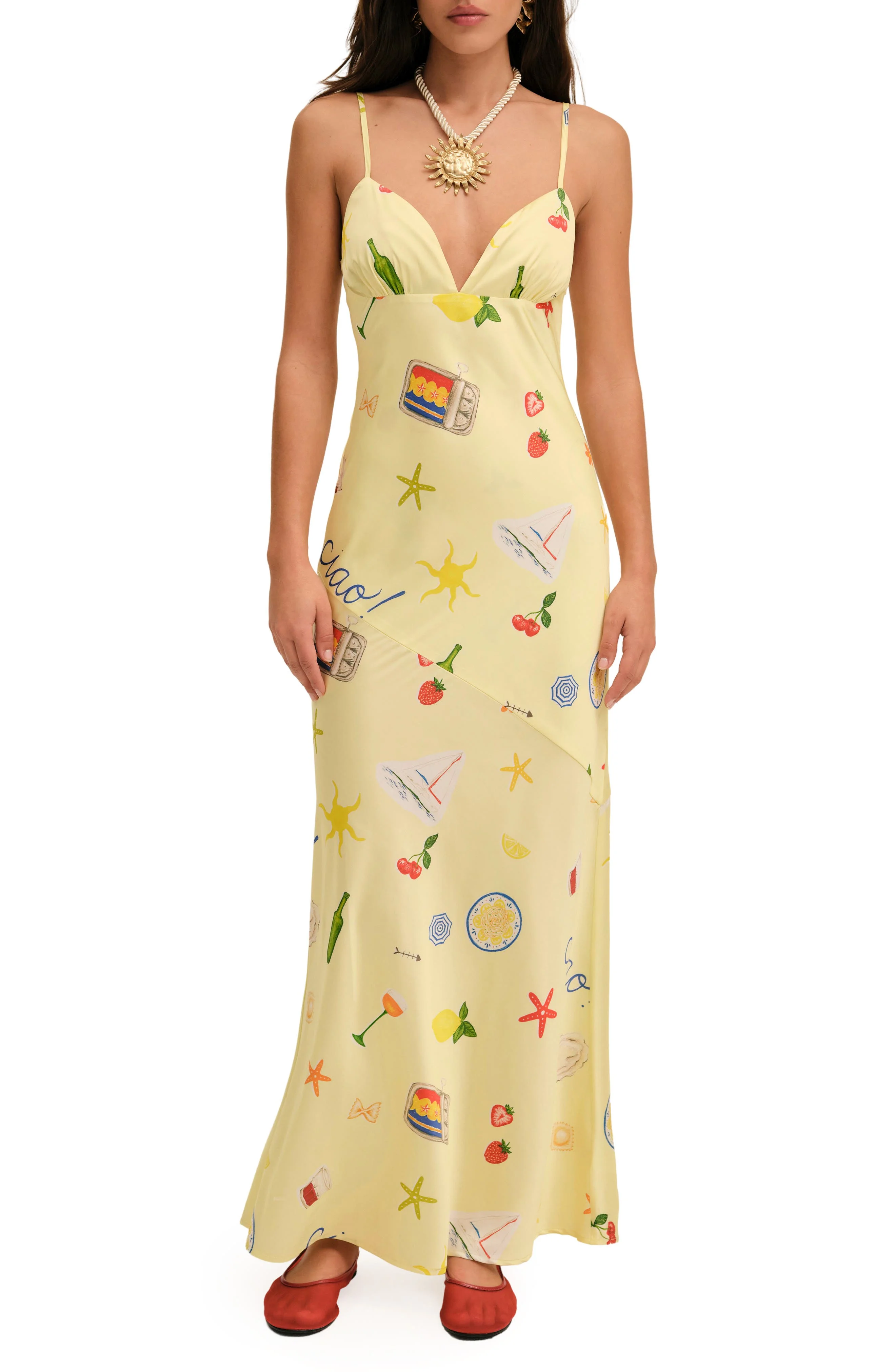 Embody the romance of a season spent along the Italian coastline in this satin maxi dress covered in aptly-themed graphics. Ties at back Deep V-neck Adjustable straps Lined 97% recycled polyester, 3% spandex Dry clean Imported