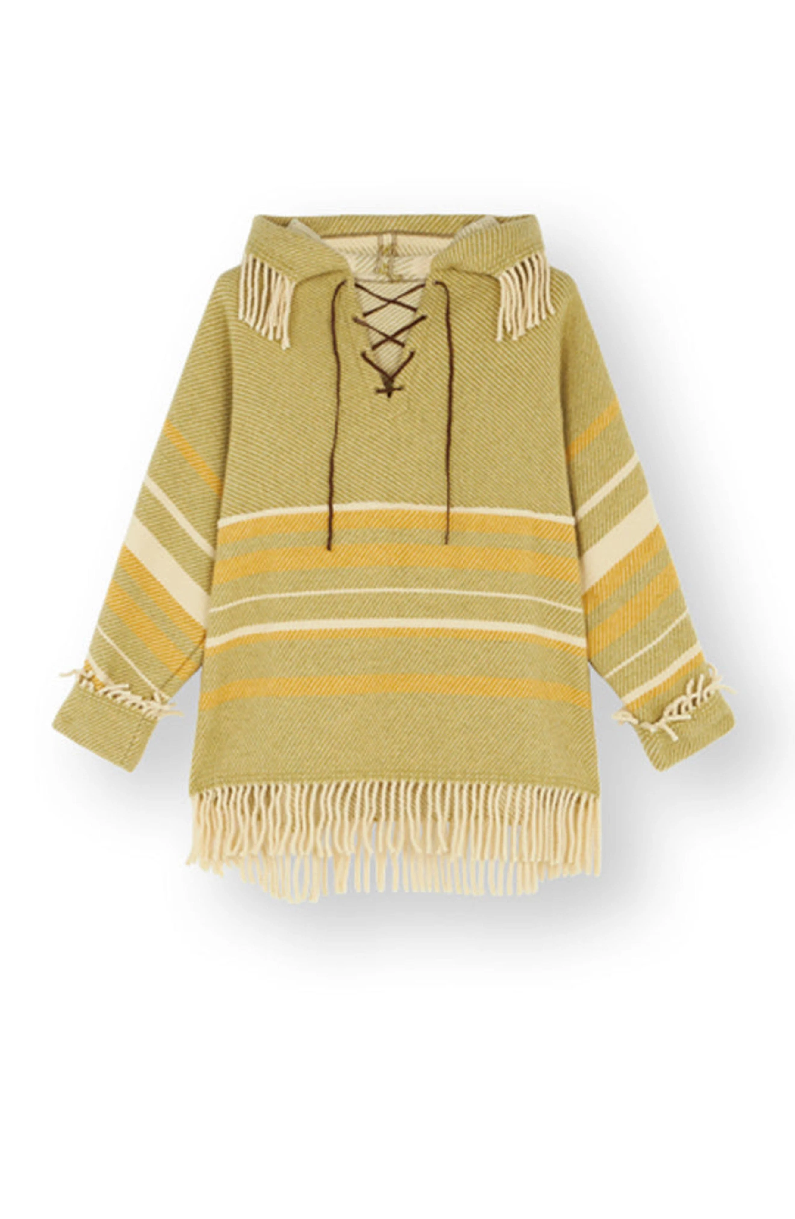 Wrap yourself in the luxurious comfort of this hooded poncho from Fortela . Crafted in Italy from a blend of wool and polyamide, this poncho features a relaxed fit and a unique bi-color striped pattern. The central neckline with laces and the fringed hood add a touch of bohemian elegance. A perfect blend of style and warmth, embodying Fortela's commitment to quality and timeless design. 70% Wool, 30% Polyamide Soft Fit Hood with Fringe Central Neck with Laces Made In Italy