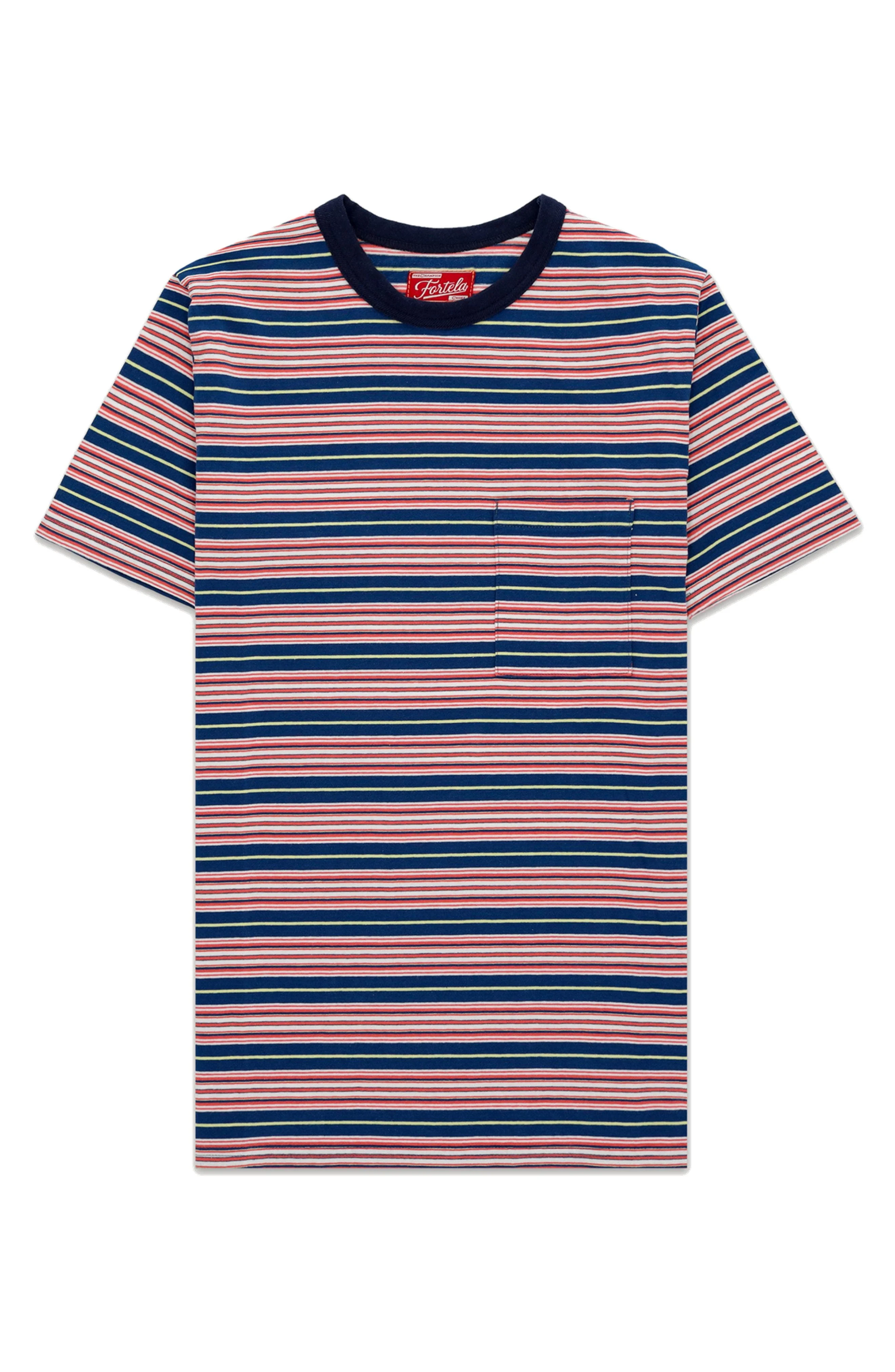 YAKUT is a striped T-shirt, made of 100% cotton, which embodies the timeless elegance and artisanal quality of the Fortela brand. T-shirts have origins that date back to the early twentieth century, initially used as underwear by workers. Over the years, thanks to the fashion of the 60s and 70s, they have become an iconic garment, a symbol of simplicity and style. Alessandro Squarzi, founder of Fortela, draws inspiration from this tradition to create a T-shirt that combines vintage charm with high-quality production. Made entirely in fine cotton , this T-shirt from the line Made in Japan offers exceptional comfort and superior durability: the cotton used guarantees a softness that persists even after numerous treatments. The tubular construction, without side seams, ensures a perfect fit and greater resistance. The patch pocket, functional and stylish, adds a distinctive element. The regular fit of the Fortela Tube T-shirt is designed to suit a variety of body types, offering the ideal balance between comfort and style. The slightly shorter length of the garment recalls the retro look of 50s and 60s T-shirts, making it perfect for those who appreciate a classic, timeless style. For an ideal match, the Fortela Tube T-shirt goes perfectly with the five pocket jeans of the brand and one of their leather belts for a casual but refined look. Adding a light jacket or a checked shirt open on top, you get a versatile outfit suitable for different occasions, from free time to evening outings. Fortela T-shirt with multicolor striped pattern Regular fit Front patch pocket Tubular Jersey Made in Japan 100% Cotton