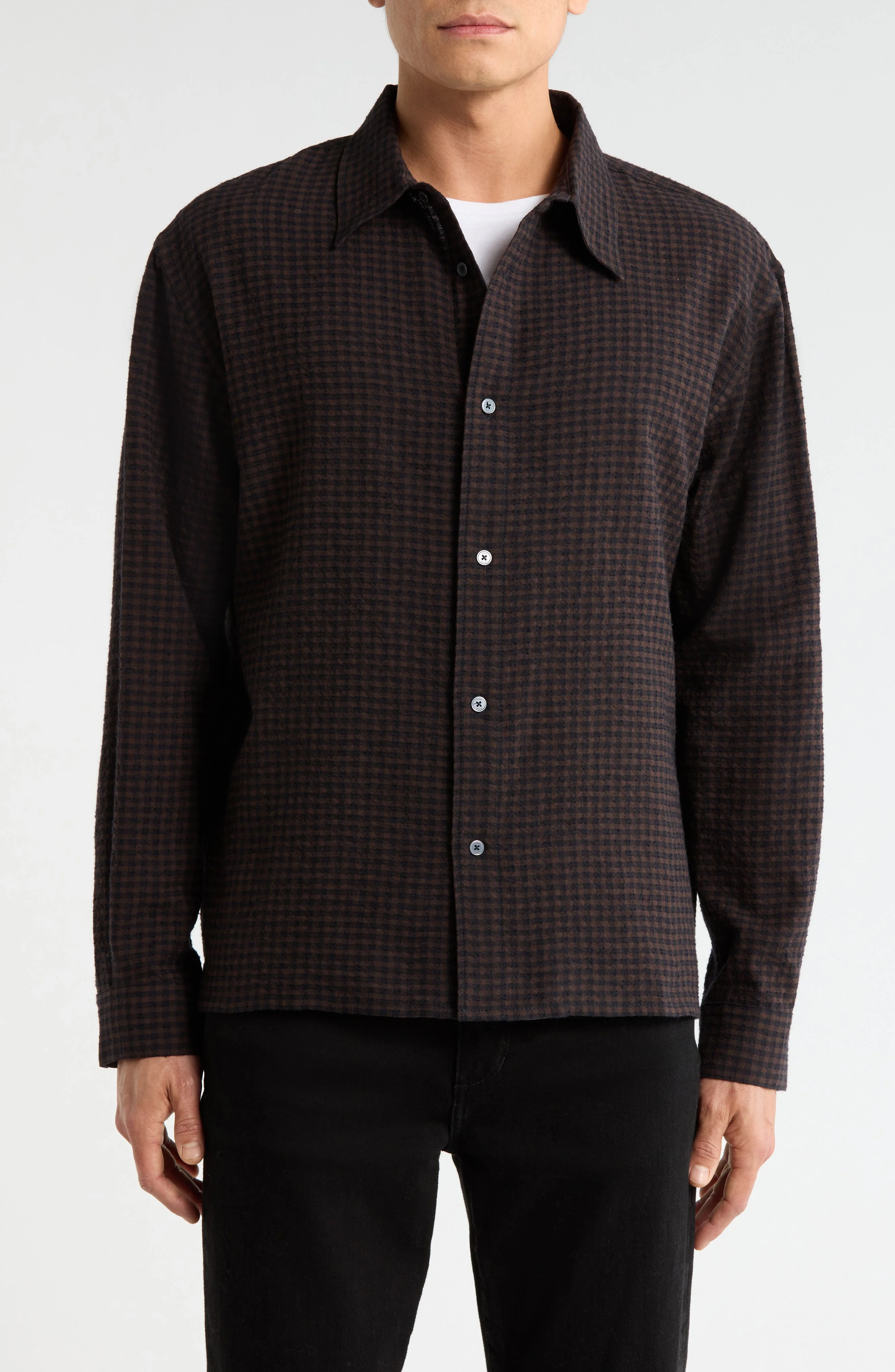 Cozy checks pattern an endlessly wearable shirt made from a blend of cotton and wool. Front button closure Spread collar Long sleeves 66% cotton, 34% wool Dry clean Made in Turkey