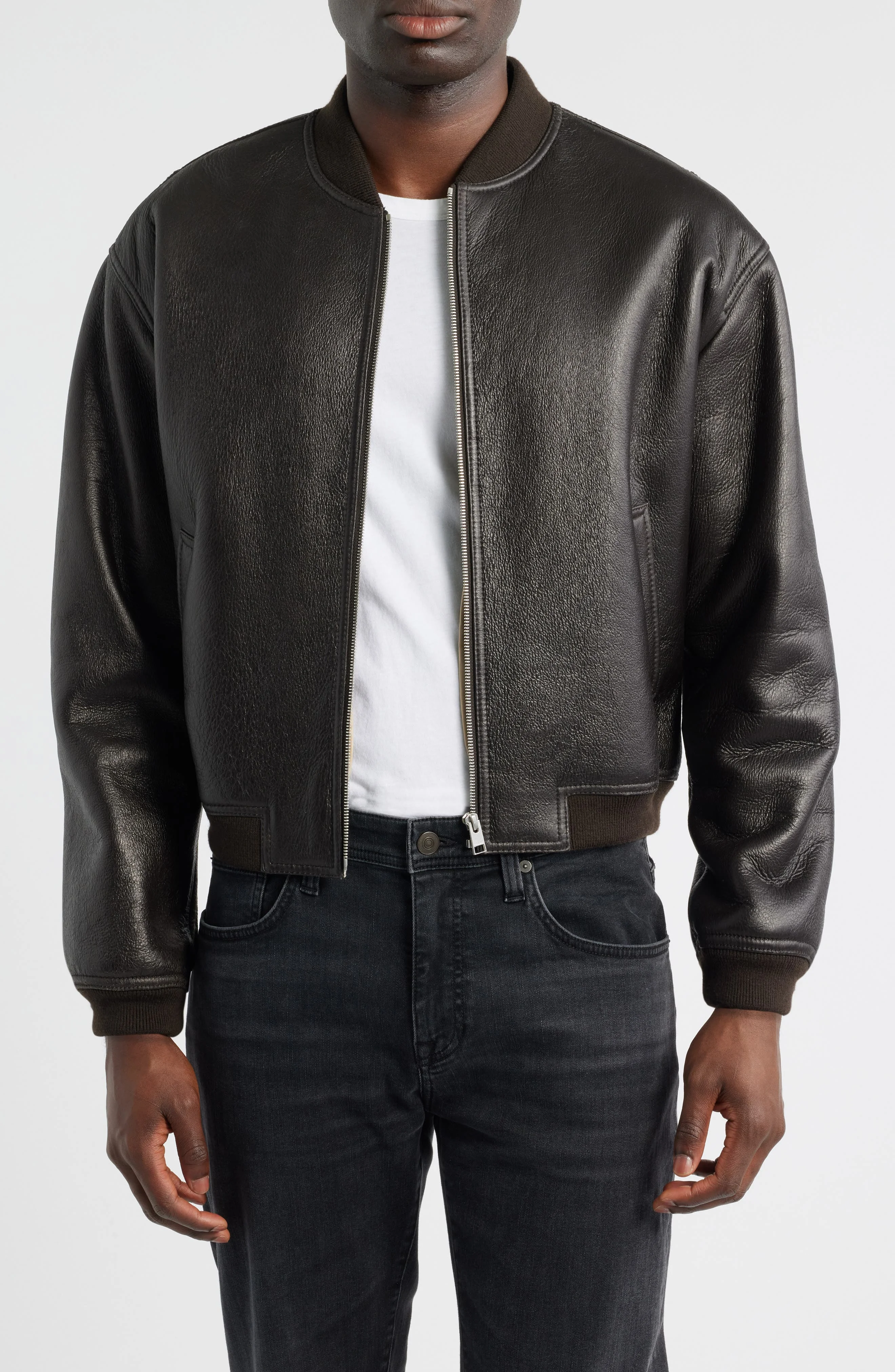 A classic bomber jackets elevates your everyday style while keeping you warm against the cold elements with its genuine-shearling lining. Front zip closure Blade collar Ribbed cuffs and hem Front welt pockets Genuine-shearling (Turkey) lining Leather Professional leather clean Made in Turkey