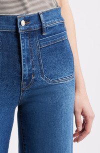 Inspired by '70s styles, these full-length palazzo jeans are remade for today with superstretchy denim and squared-off patch pockets. 29" inseam; 23" leg opening; 11" front rise; 14" back rise (size 29) Zip fly with button closure Five-pocket style 49% cotton, 21% recycled cotton, 17% recycled polyester, 11% lyocell, 2% elastane Machine wash, dry flat Imported