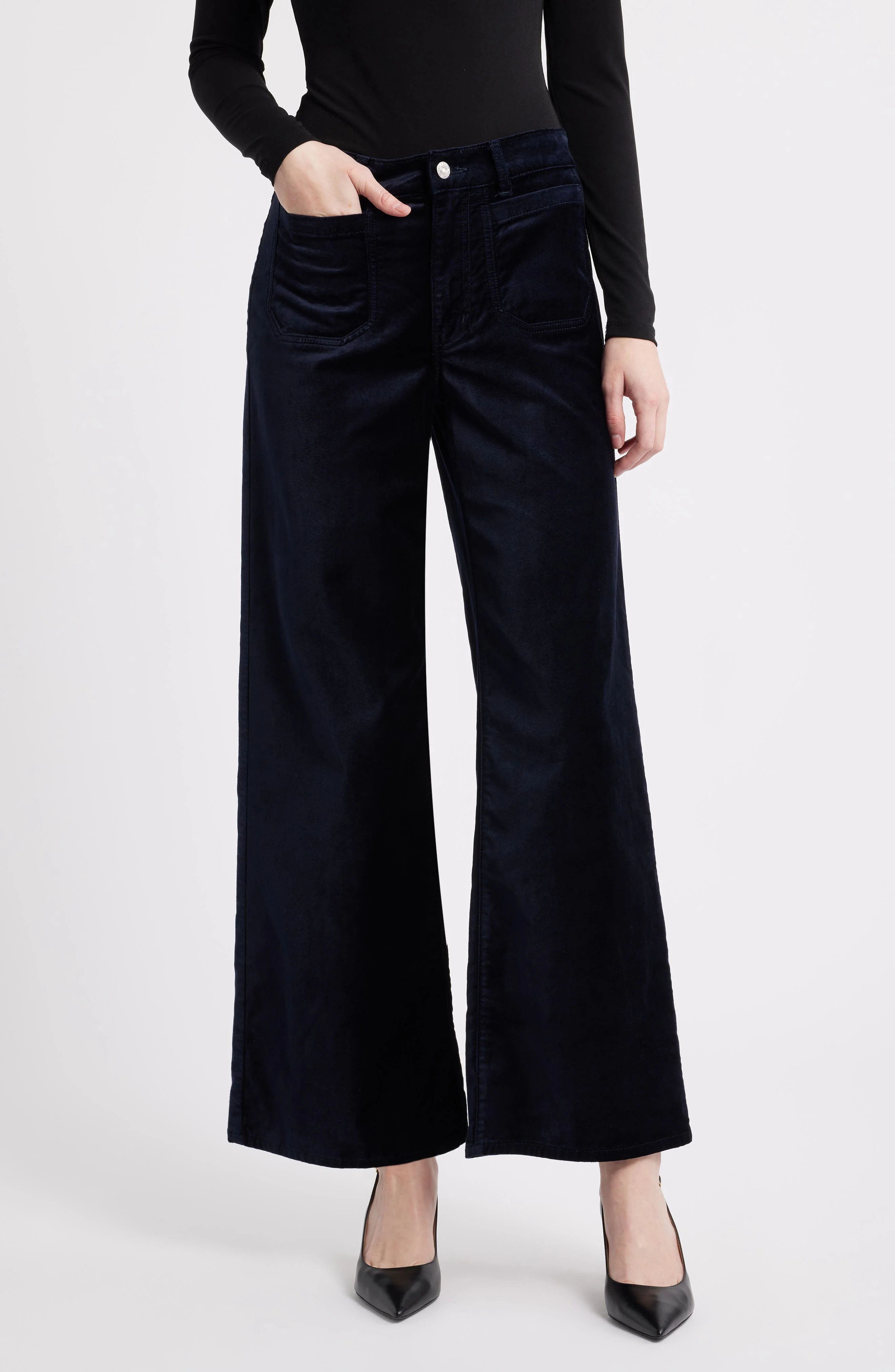 Luxe velveteen enhances the sleek, classic silhouette of these wide-leg pants that play a key role in your casual wardrobe. 31" inseam; 22 1/2" leg opening; 11 1/4" front rise Zip fly with button closure Front patch pockets; back patch pockets 54% cotton, 44% rayon, 2% elastane Machine wash, tumble dry Made in Turkey