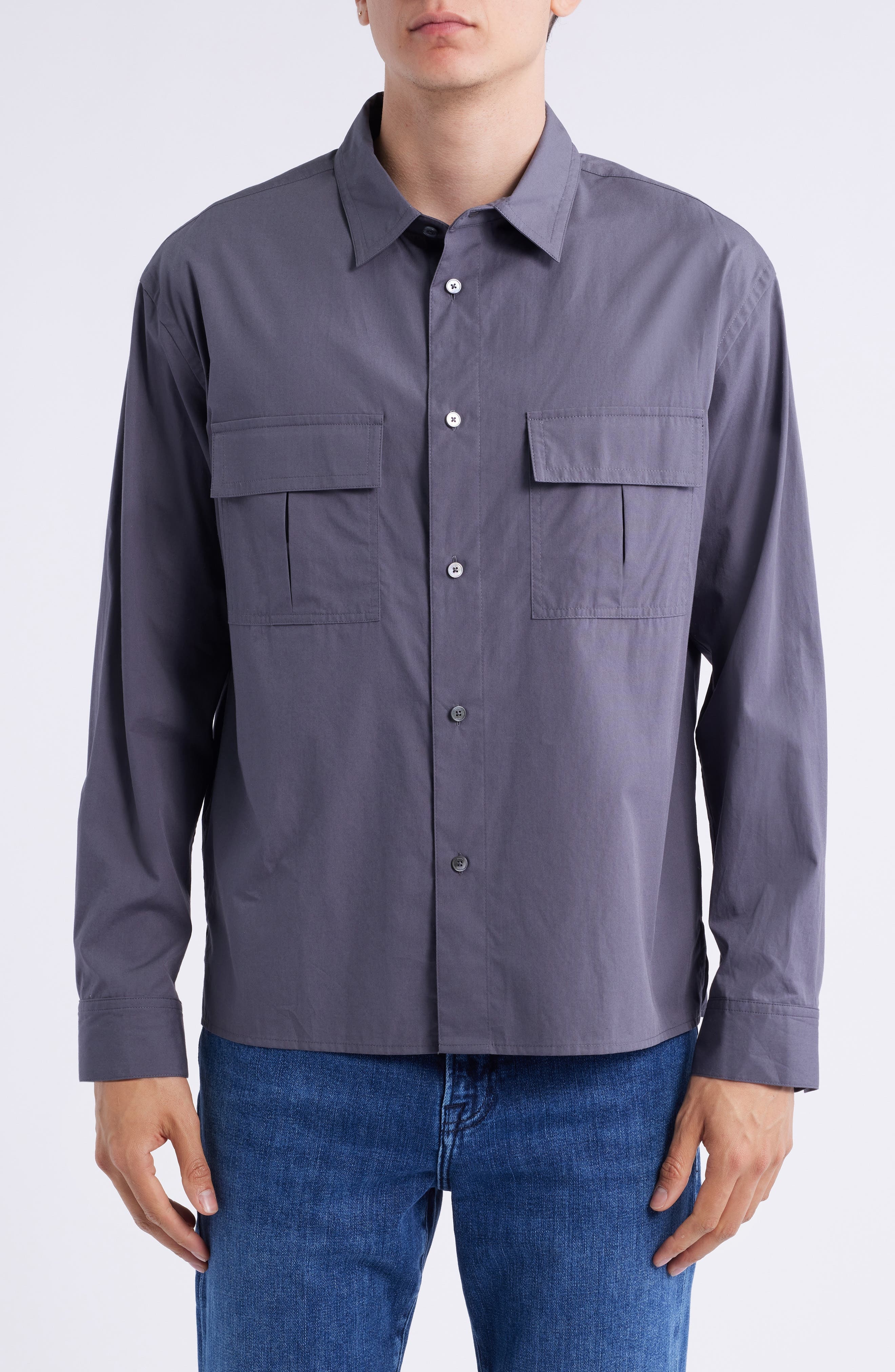 A pair of practical patch pockets punctuate the chest of this lightweight overshirt crafted from breathable cotton. Front button closure Spread collar Long sleeves with button cuffs Chest button-flap patch pockets 100% cotton Machine wash, dry flat Imported