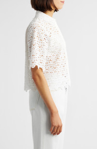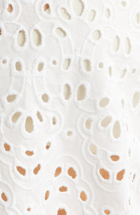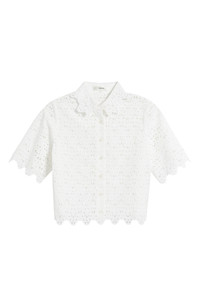 Airy eyelets decorate this cotton button-up shirt finished with a sweet scalloped trim. Front button closure Spread collar Short sleeves 100% cotton Dry clean Imported