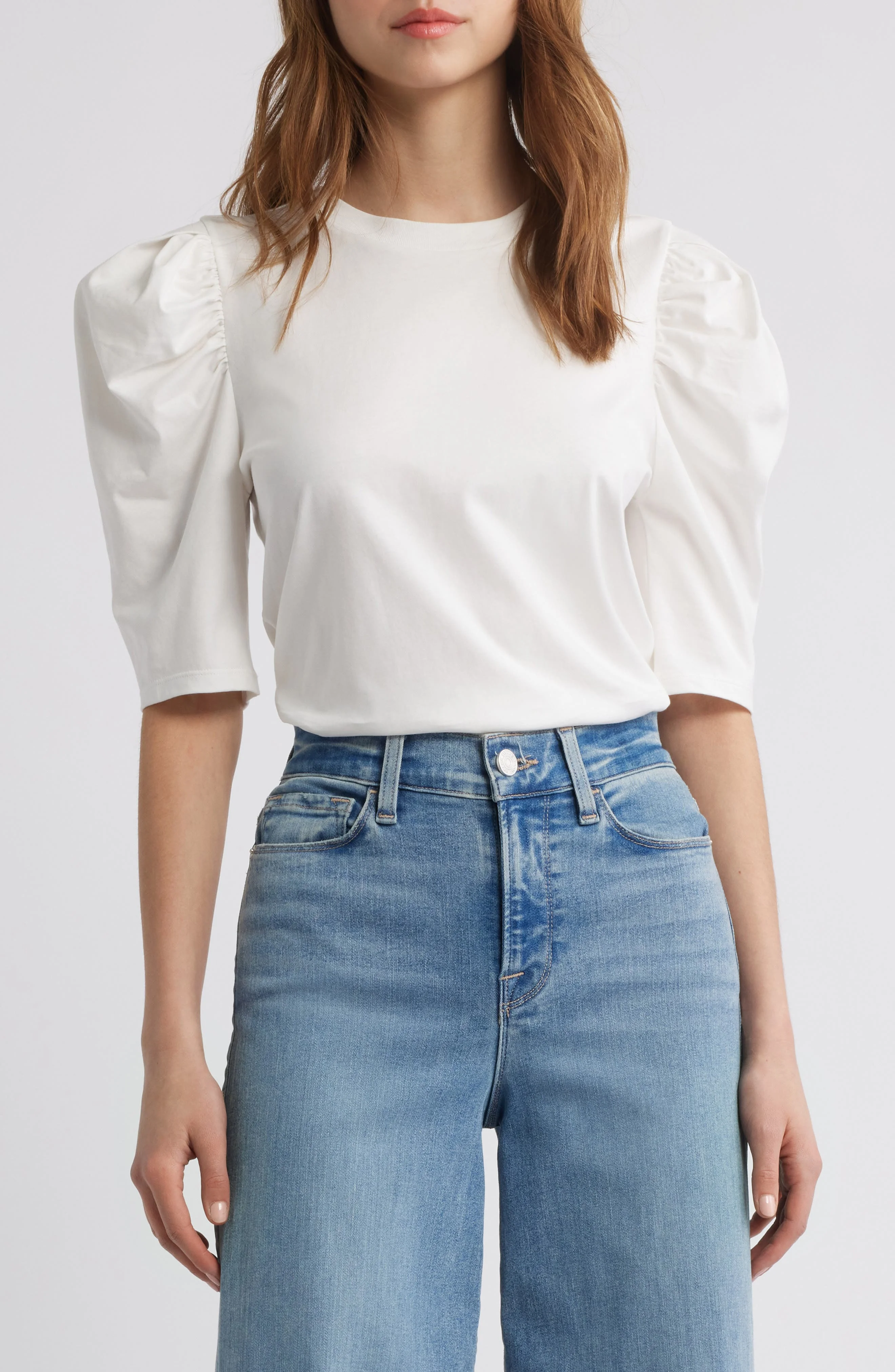 Dramatic puff sleeves make this soft, nicely draped organic-cotton top stand out from a classic tee. 22" length Crewneck Elbow-length sleeves 100% organic cotton Machine wash, dry flat Made in Portugal