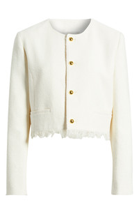 Bring classic polish to your ensemble in a poised tweed jacket updated with fraying edges, glossy domed buttons and welt pockets framing the front. 18 1/2" length Front button closure Jewel neck Front welt pockets 64% cotton, 33% polyester, 3% other fibers Dry clean Made in Italy